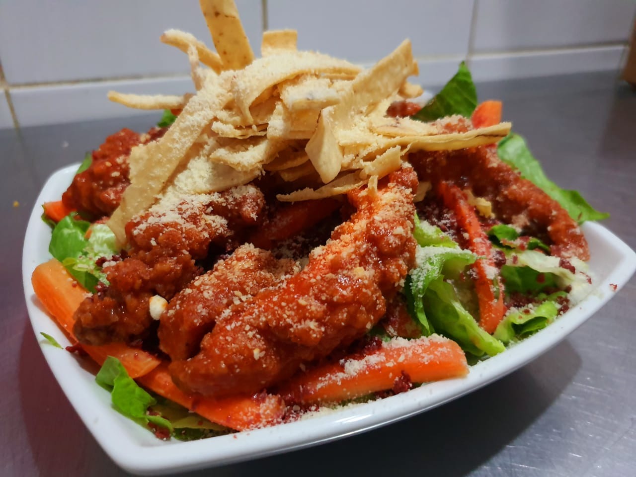 Lechuga, zanahoria, tender de pollo bañado en salsa búfalo 150g, trocitos de tocino, queso parmesano, crotones, tiritas de tortilla frita y aderezo a elegir 59 ml.