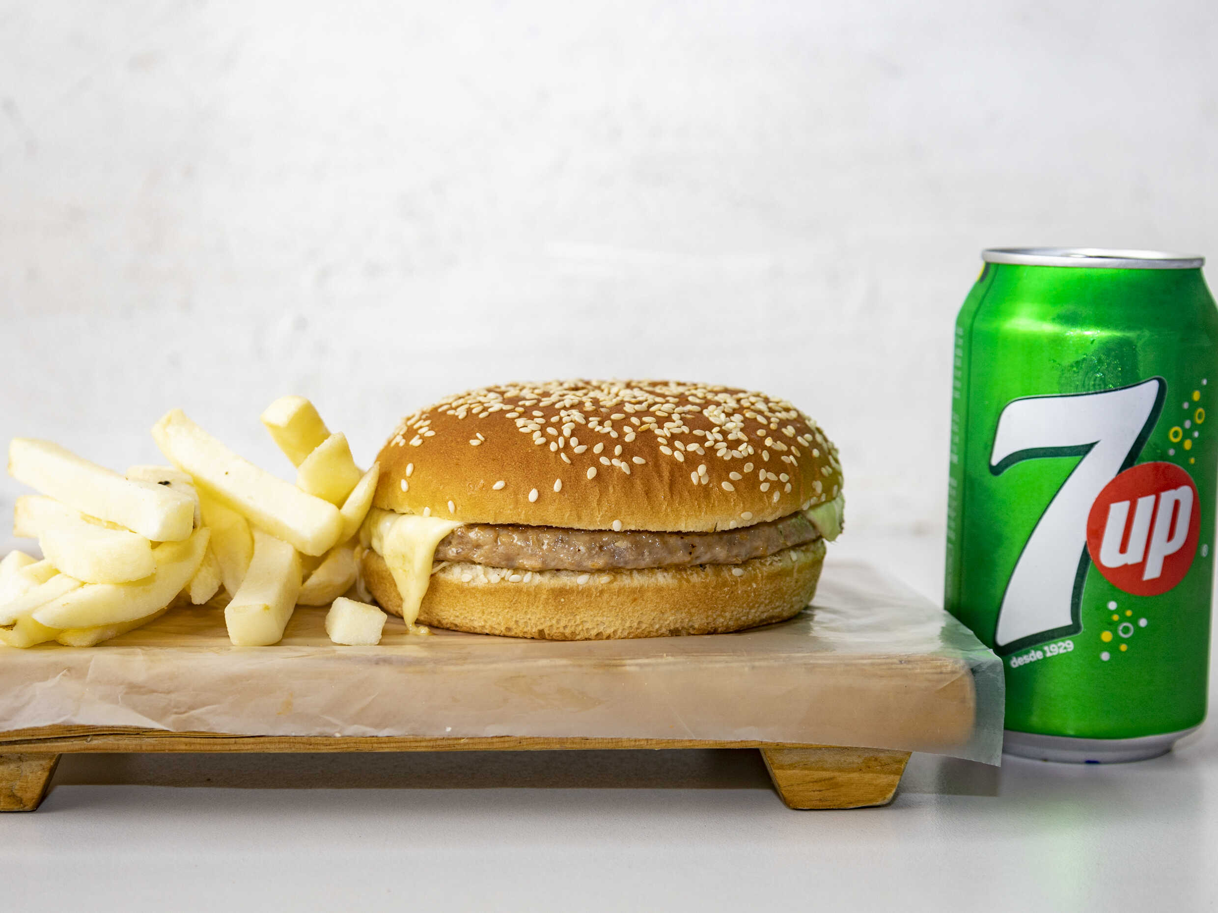 Hamburguesa de res + acompañamiento + refresco (355 ml)