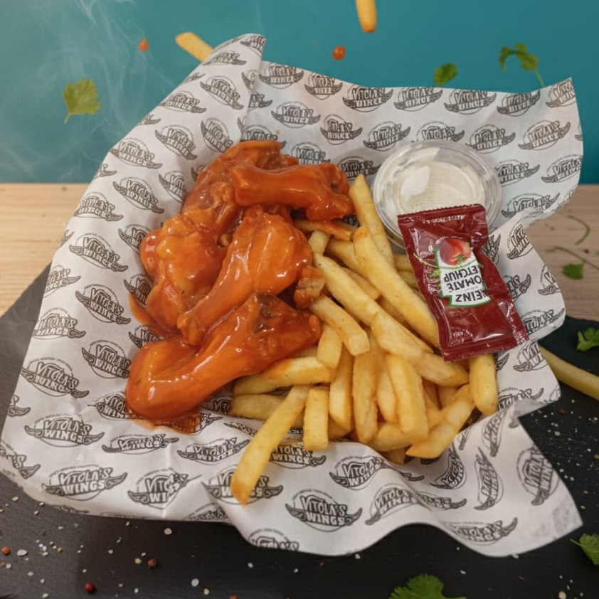 6 alitas bañadas en tu salsa favorita + 150 grs de papas gratis