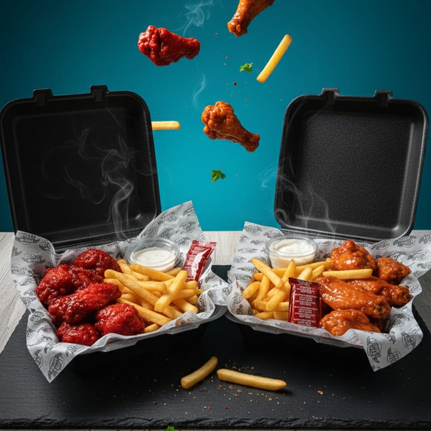 8 alitas + 200 grs de boneless + 250 grs de papas a la francesa (la primera salsa es de alitas y la segunda de boneless)