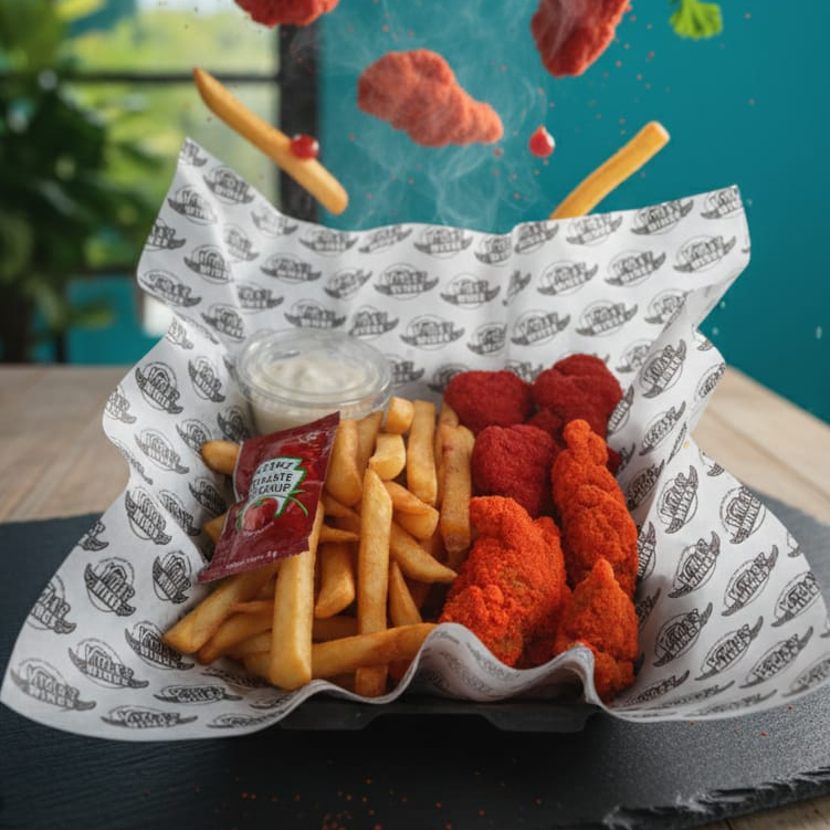 200 grs de boneless bañados en tu salsa favorita, 200 grs de papas y 3 dedos de queso