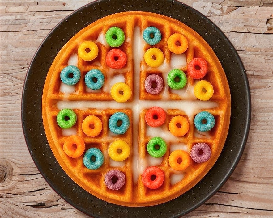 Waffle con froot loops y lechera sobre una cama de queso crema.