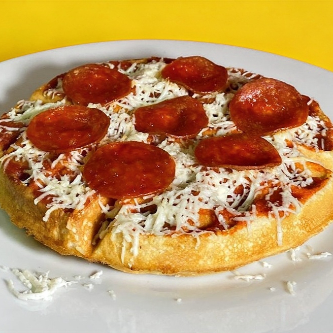 Waffle dorado con topping de queso fundido y rebanadas de pepperoni crujiente. Una combinación irresistible al estilo pizza.