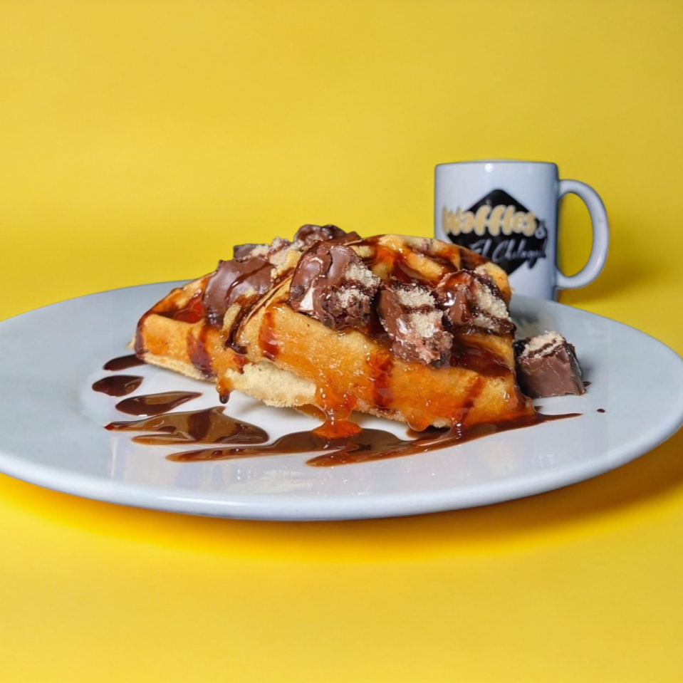 Waffle original con mermelada de fresa, trozos de gansito y chocolate liquido.