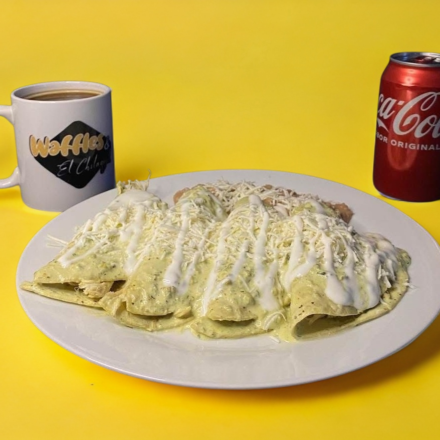 Tortillas rellenas de queso, bañadas en salsa y servidas con crema, queso fresco y cebolla. Clásicas, cremosas y llenas de sabor.