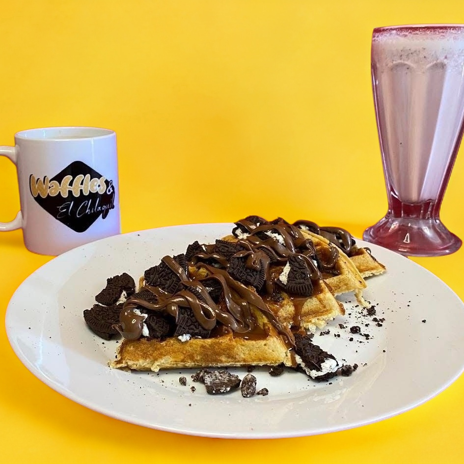 Waffle dulce cubierto con trozos de galleta, chispas de chocolate y crema batida. Un antojo irresistible para los amantes de lo dulce.