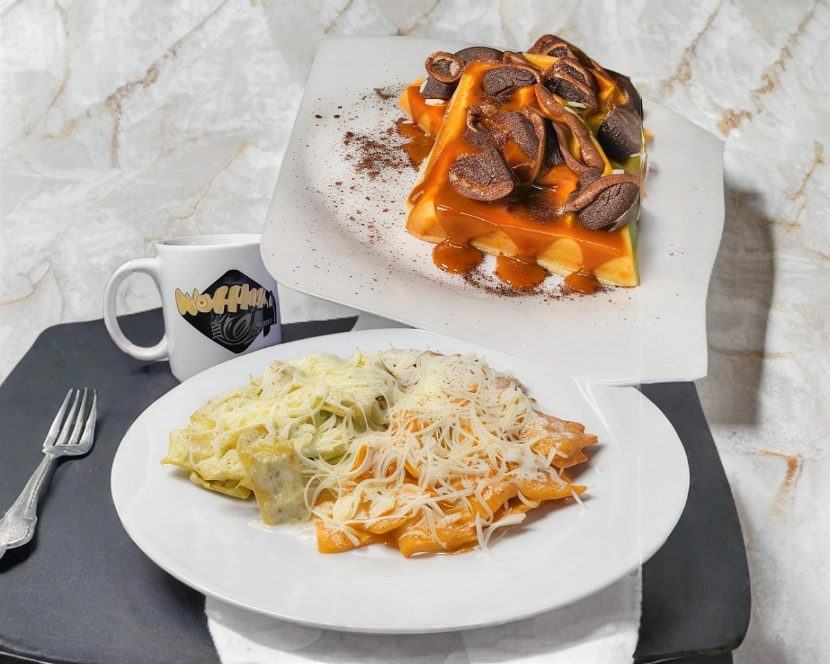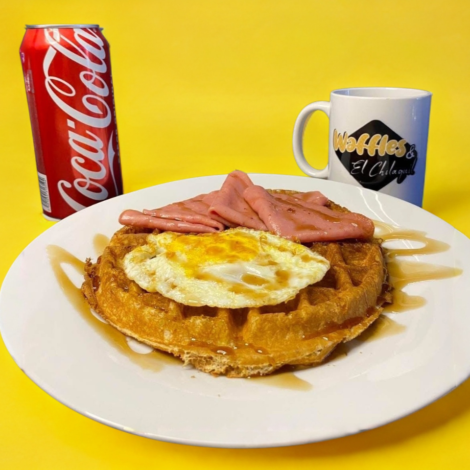 Waffle suave y ligeramente crujiente, acompañdo de queso fundido y jamón caliente. Ideal para empezar el día con sabor y energia.