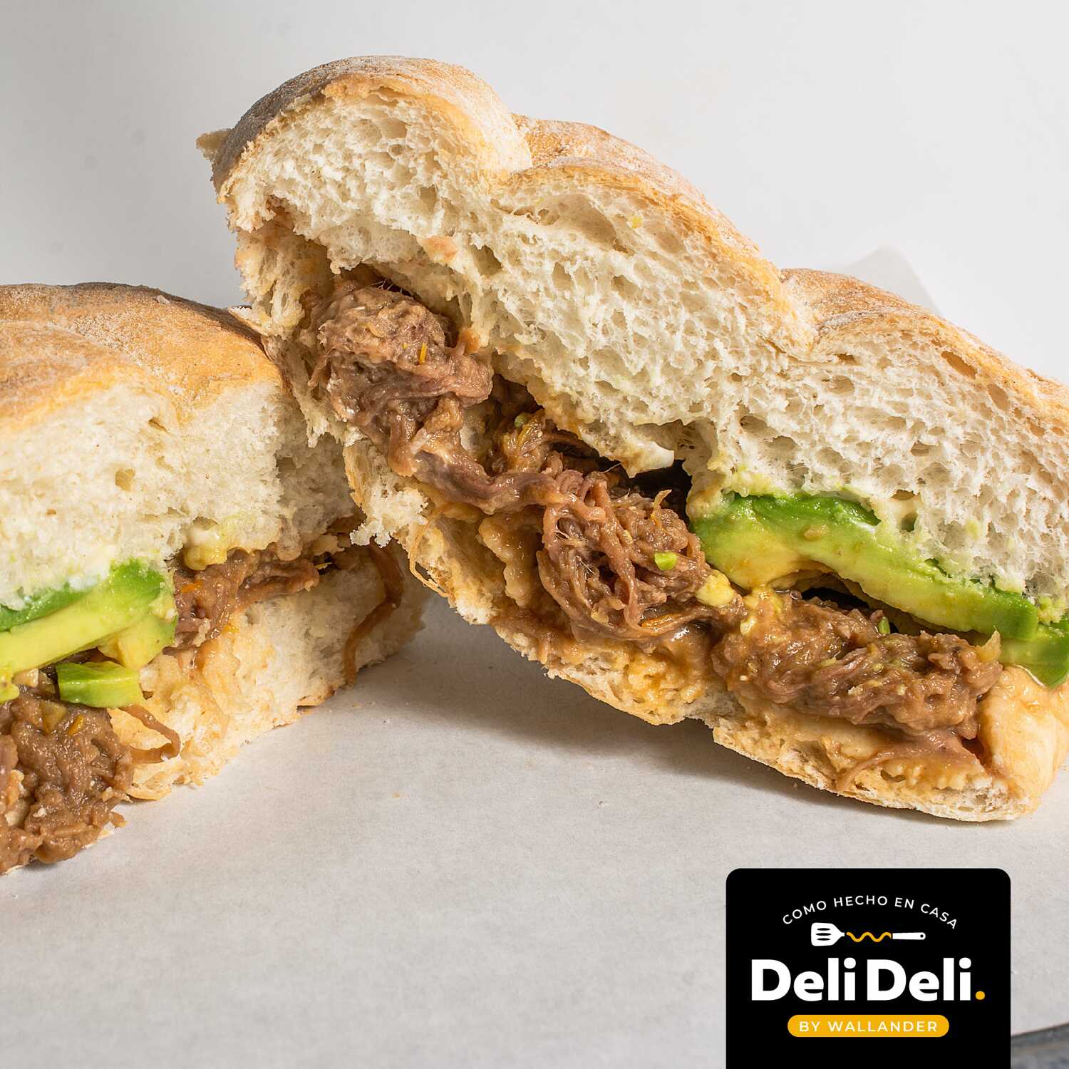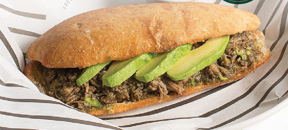 Pan Chapata Artesanal, conDeliciosa pierna de cerdo horneada en salsa verde, con aguacate y mayonesa casera.