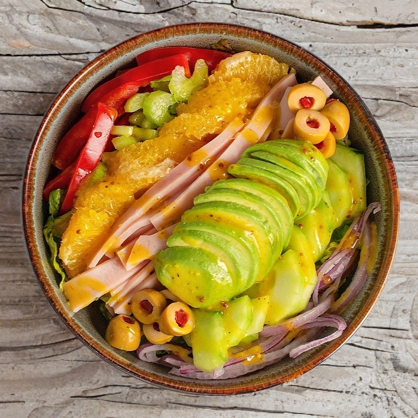 Mix de lechugas, cebolla morada, supremas de naranja, pepino, pimiento verde, aguacate, aceitunas verdes, apio, arándanos y aderezo de mostaza.