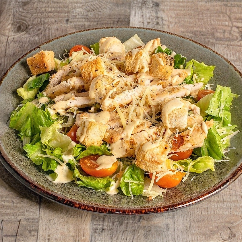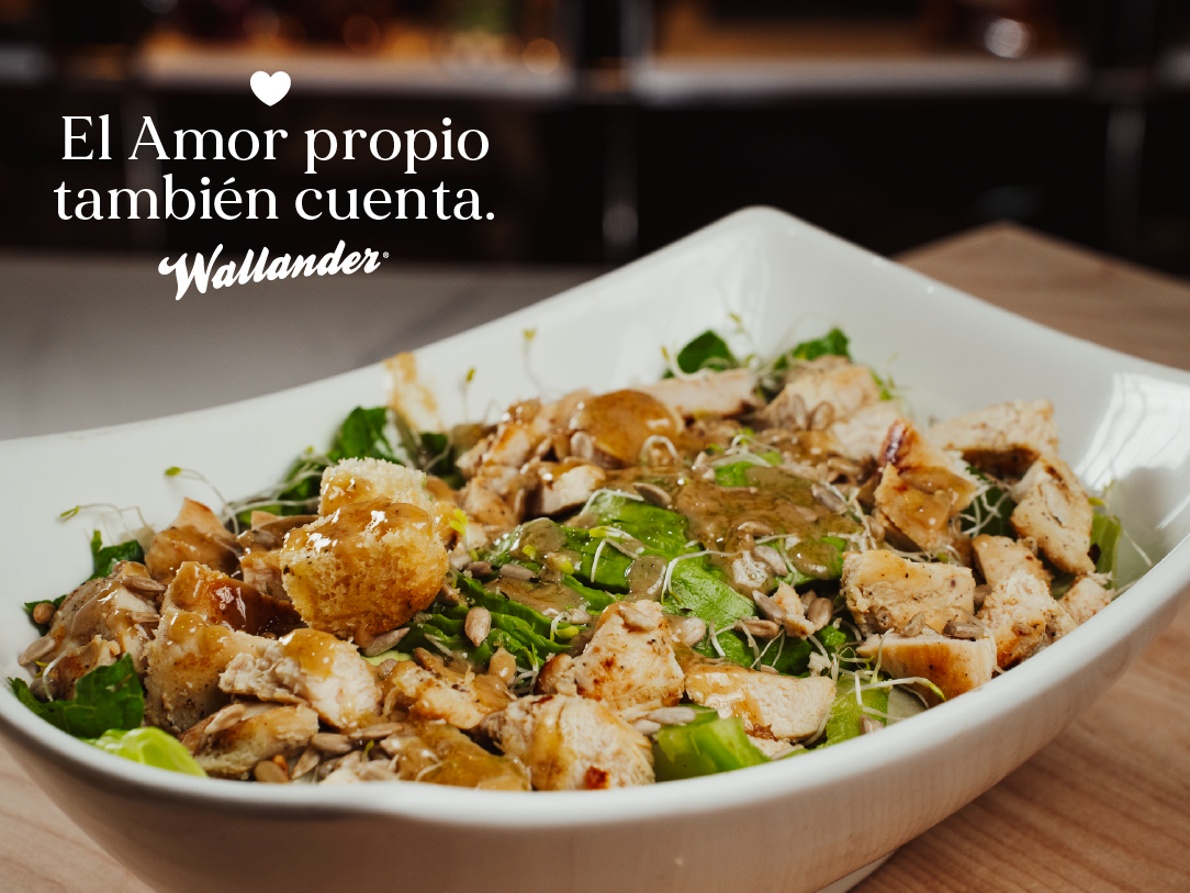 Fresca ensalada con lechuga sangría, tomate cherry, cebolla morada, aguacate, pollo a la plancha, con vinagreta de arroz y ajonjolí.
