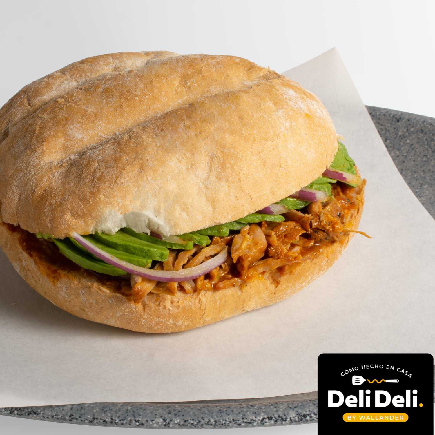 Producto Exclusivo Plataforma: Telera recién horneada con carne de puerco marinada y cocinada lentamente, se acompaña de frijoles refritos, cebolla morada, mayonesa y aguacate.