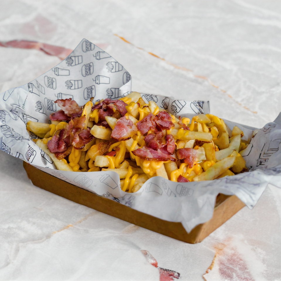 Papas fritas acompañadas de tocino y un dip de queso amarillo líquido.