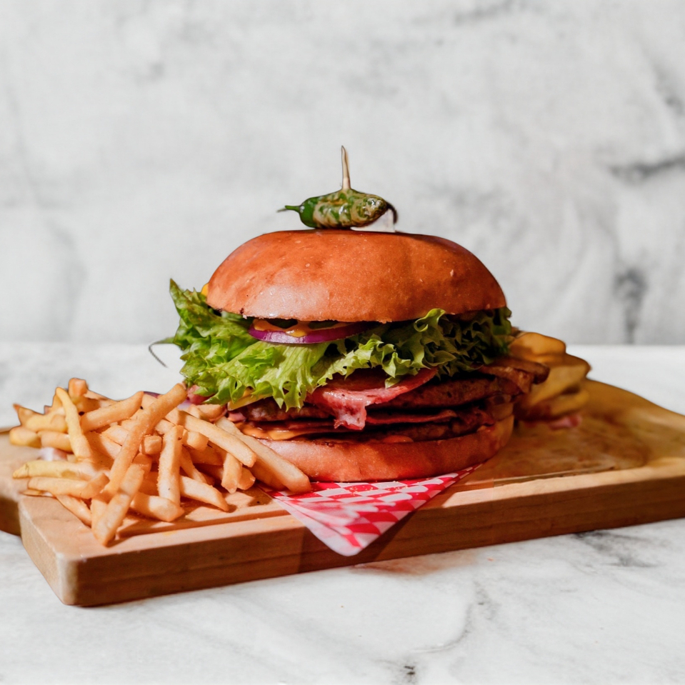 150 g De carne de res y acompañada de 150 gramos de papas fritas.