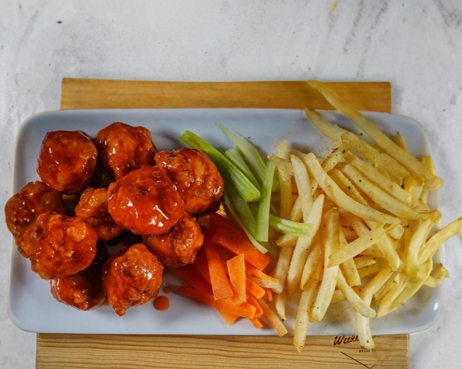 750 g De boneless, 1 papas weekend, 6 dedos de queso y 10 aros de cebolla, no incluye ranch. Peso en crudo.