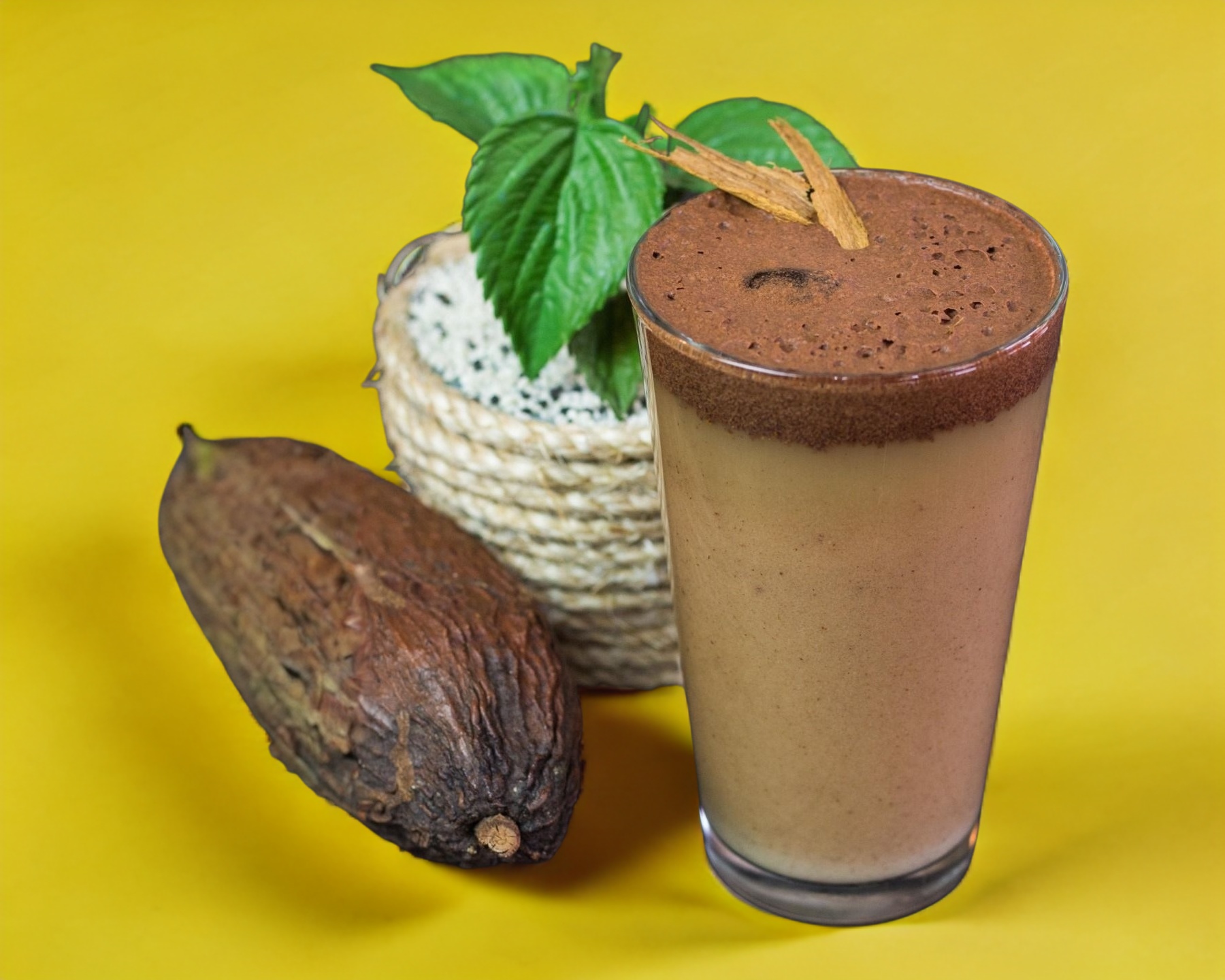 Bebida a base de 60% cacao de sabor dulce al natural o mezclado con menta, avellana, nuez, cardamomo y triada (jengibre, canela y cardamomo) preparado con leche