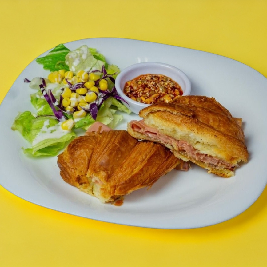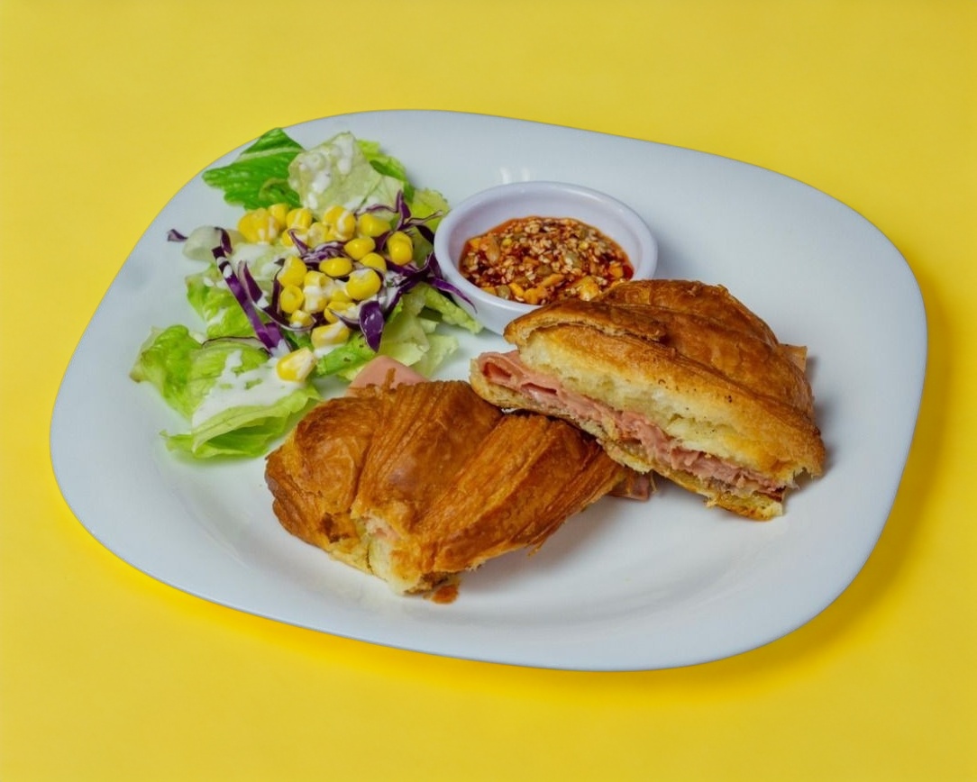 Cuernito de mantequilla artesanal relleno de jamón y queso gratinado