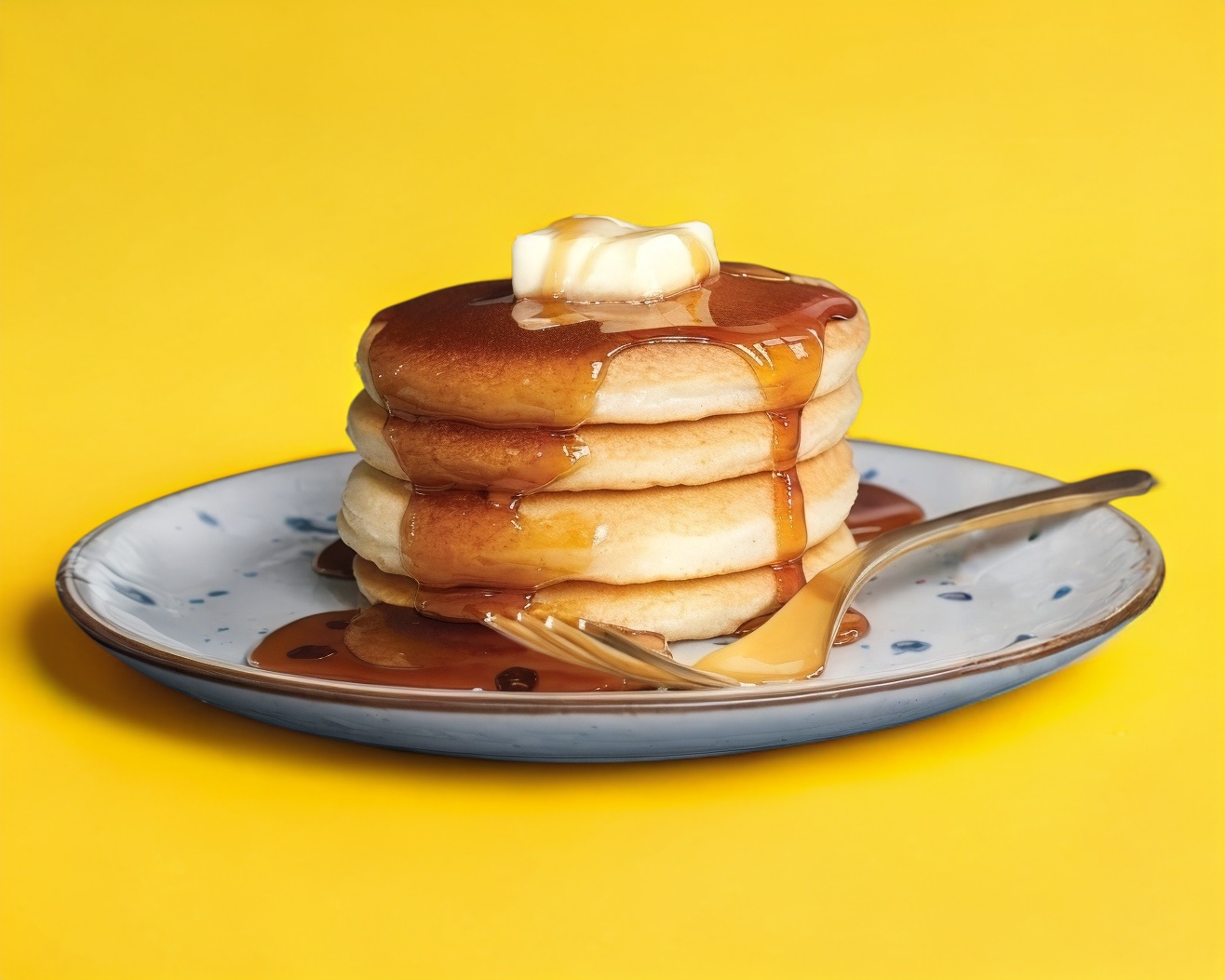 Tres piezas de panecillos esponjosos, acompañados de miel maple.