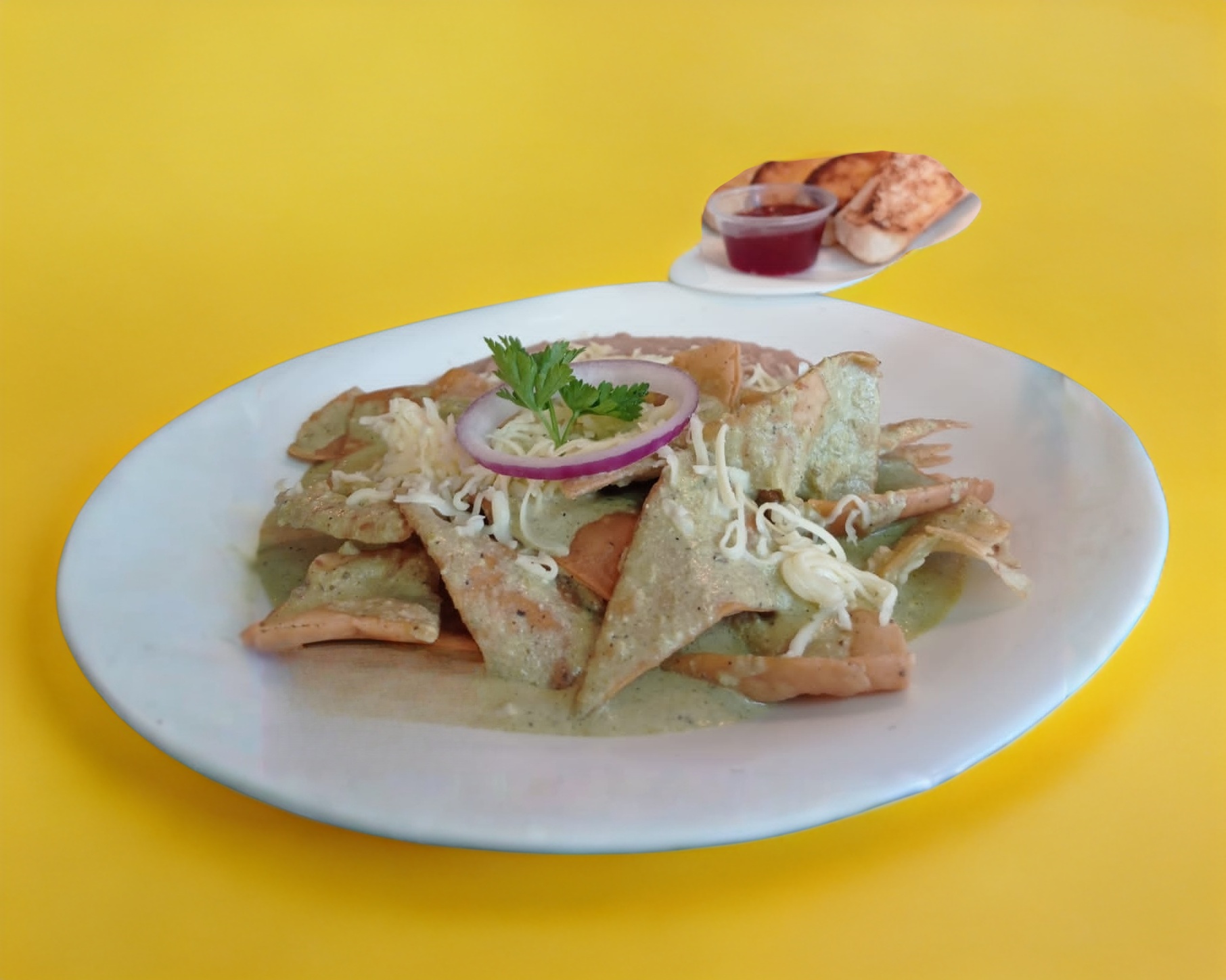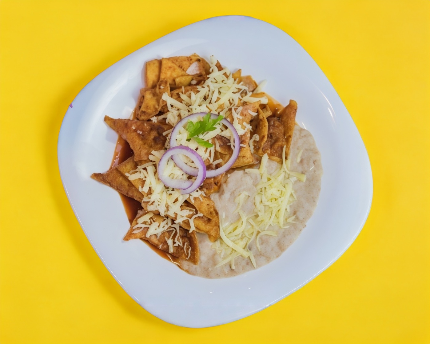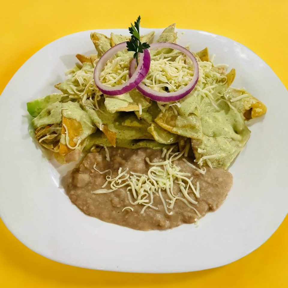 Tortilla de maíz cortadas, frita y bañada en salsa poblana acompañada de frijoles refritos y queso.
