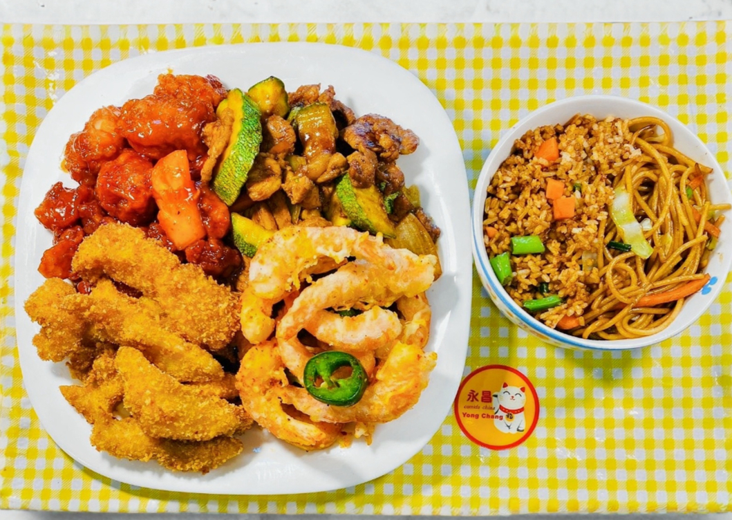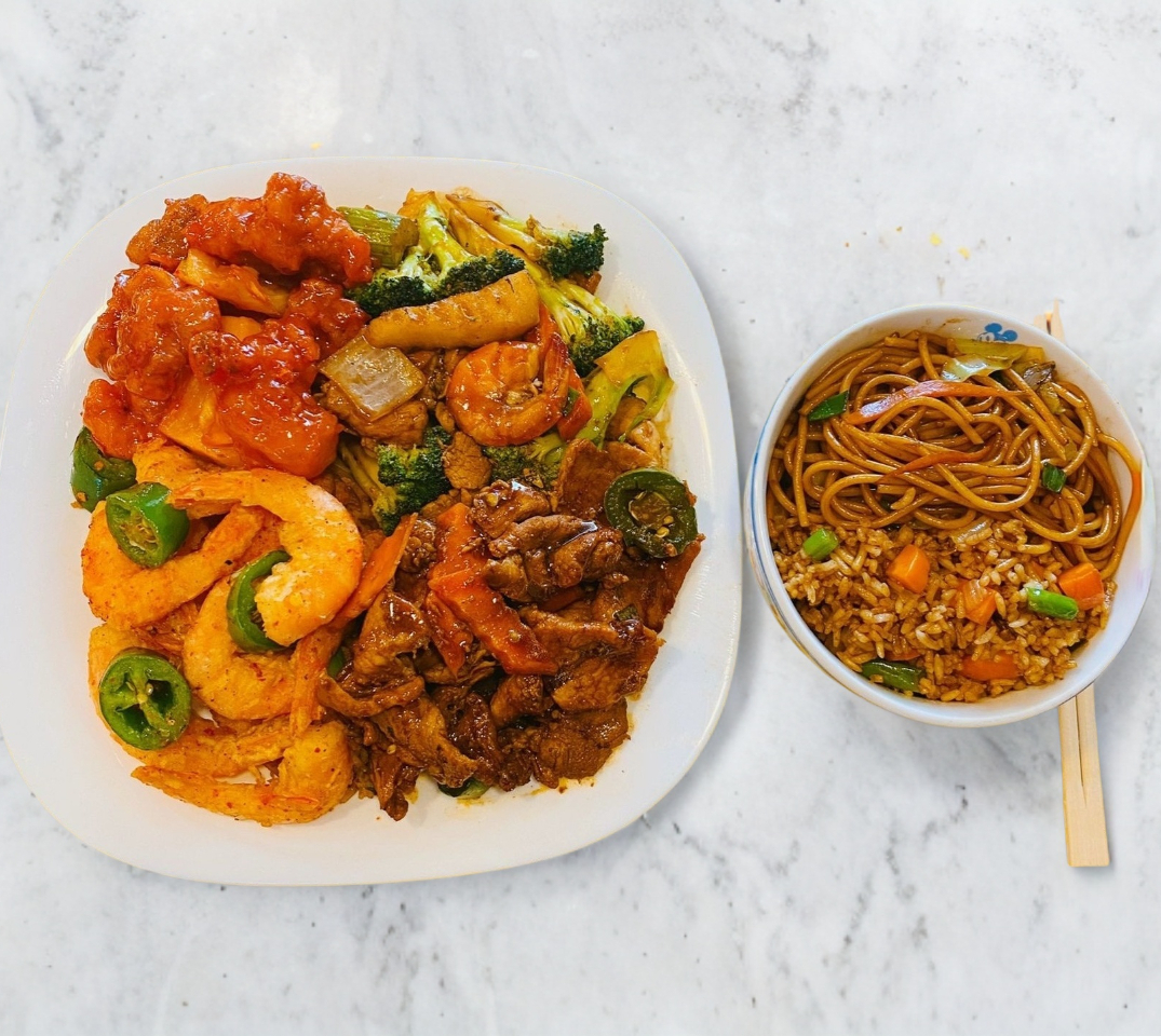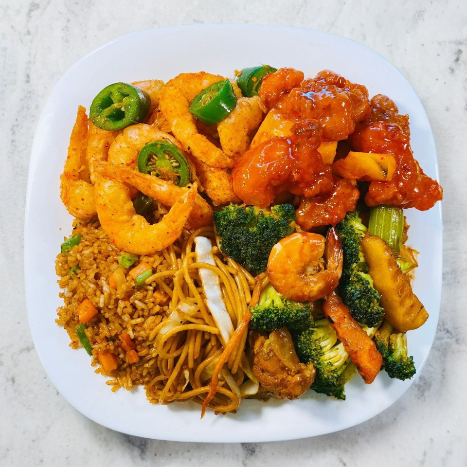Camarón enchilado, 3 guisos, arroz frito o espagueti.