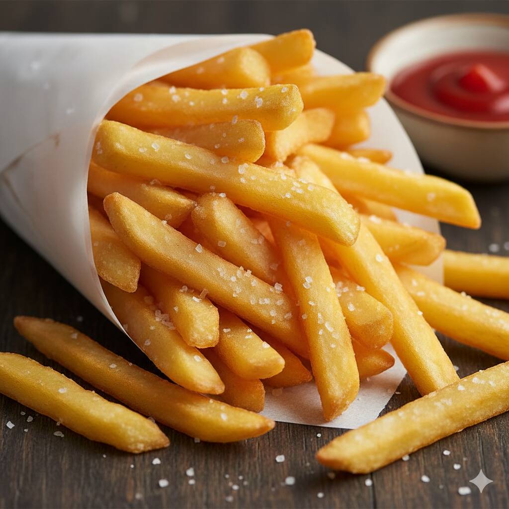 Papas a la francesa bañadas en sal, incluye salsa kétchup 60ml.