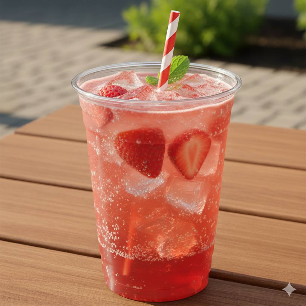 Bebida italiana refrescante a base de agua carbonatada hielo y jarabe de fresa 16oz