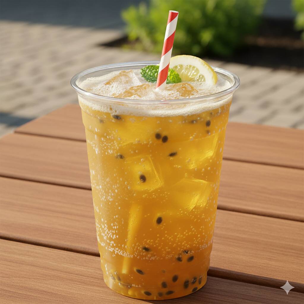 bebida refrescante que se prepara mezclando agua carbonatada con un jarbe sabor maracuya y hielo.