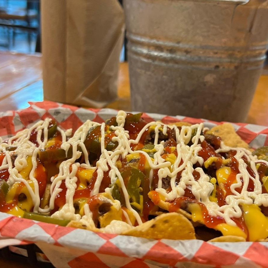 Papas a la francesa, aros de cebolla, salsa BBQ carne de res 100% premium, aderezos, queso amarillo, vegetales, pepinillos y jalapeños
