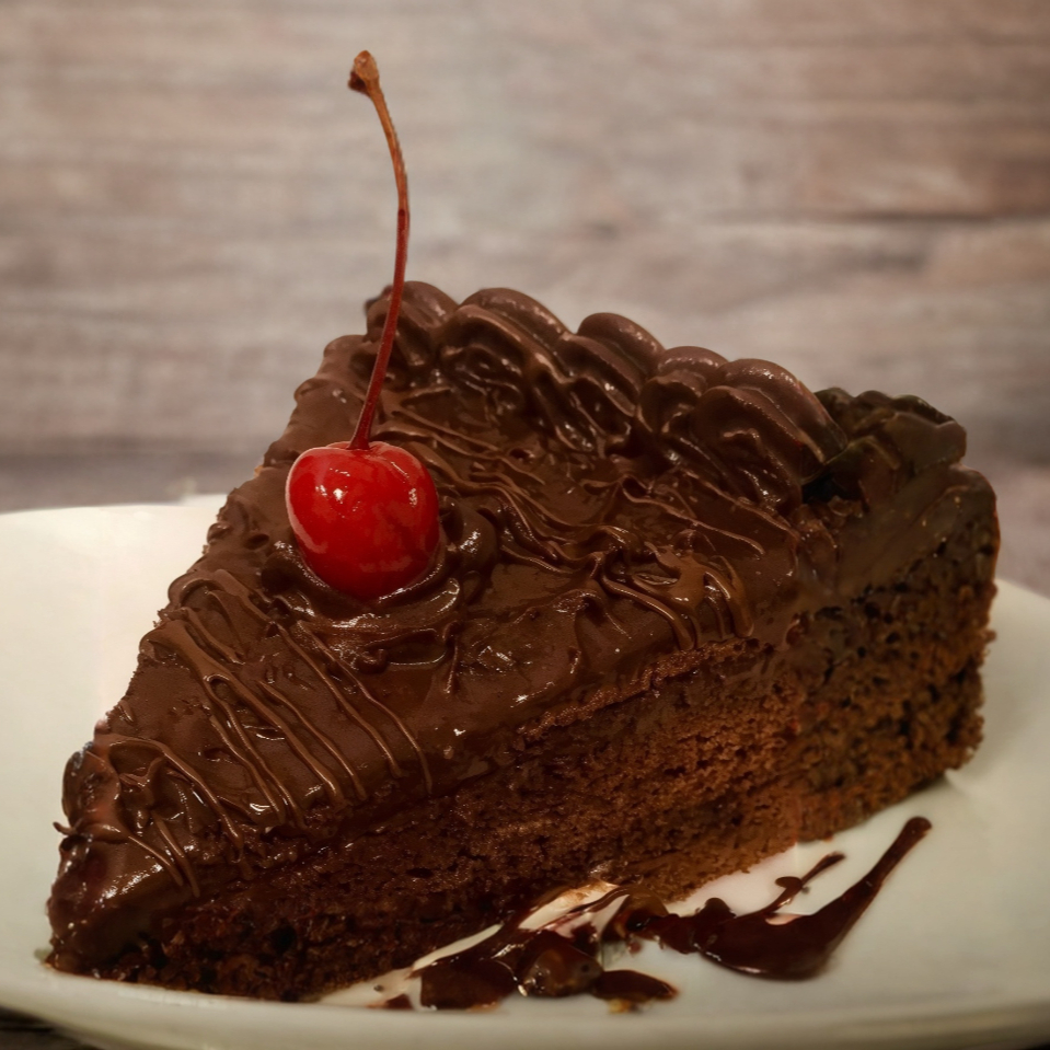 Rebanada de pastel con cobertura y relleno crema de queso.