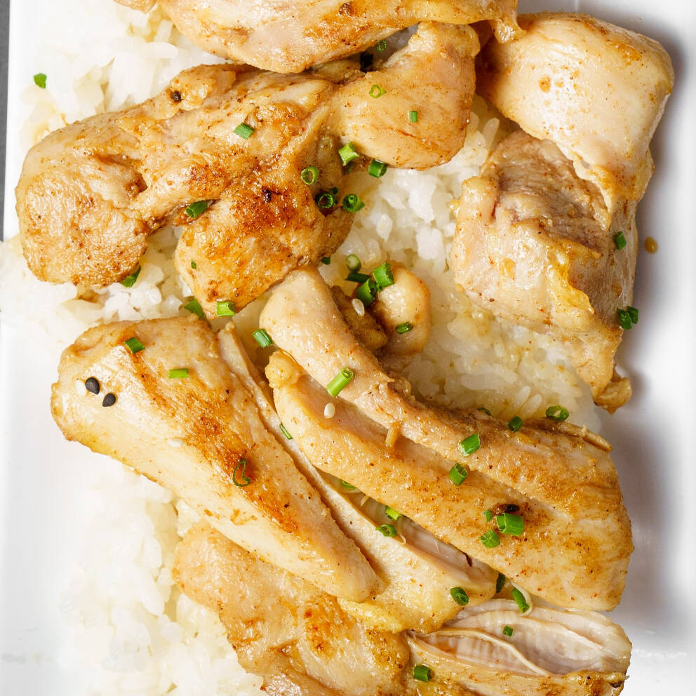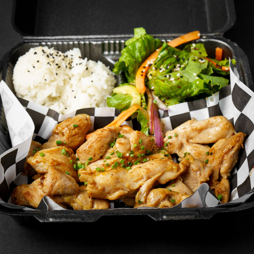 Cama de arroz de 170 gramos, acompañada con delicioso pollo 200 gramos, estilo teriyaki.