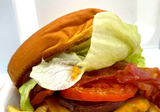 pan + carne + queso +tocino +aderezos +cebolla crispy