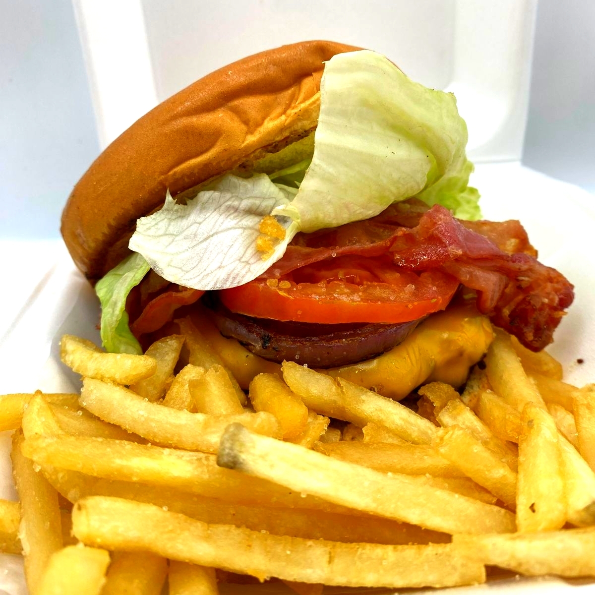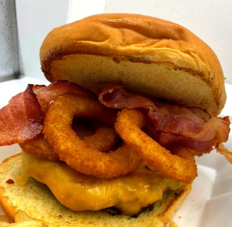 pan + carne + queso +tocino +aderezos +cebolla crispy + 3 AROS+1/2 PAPAS + BBQ