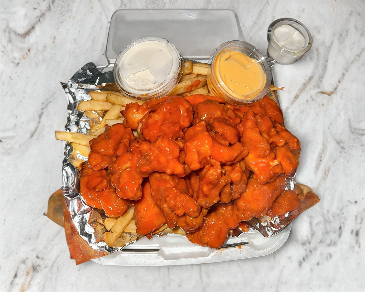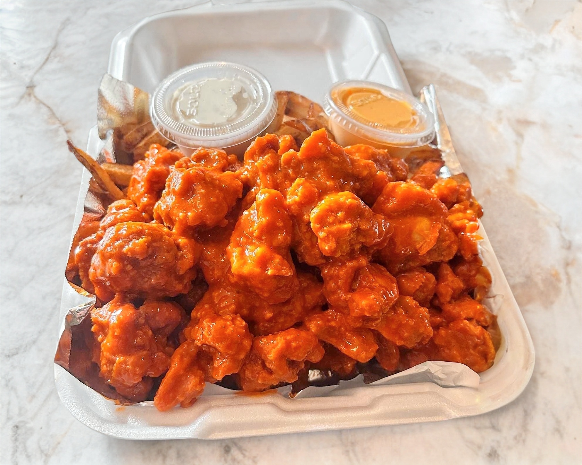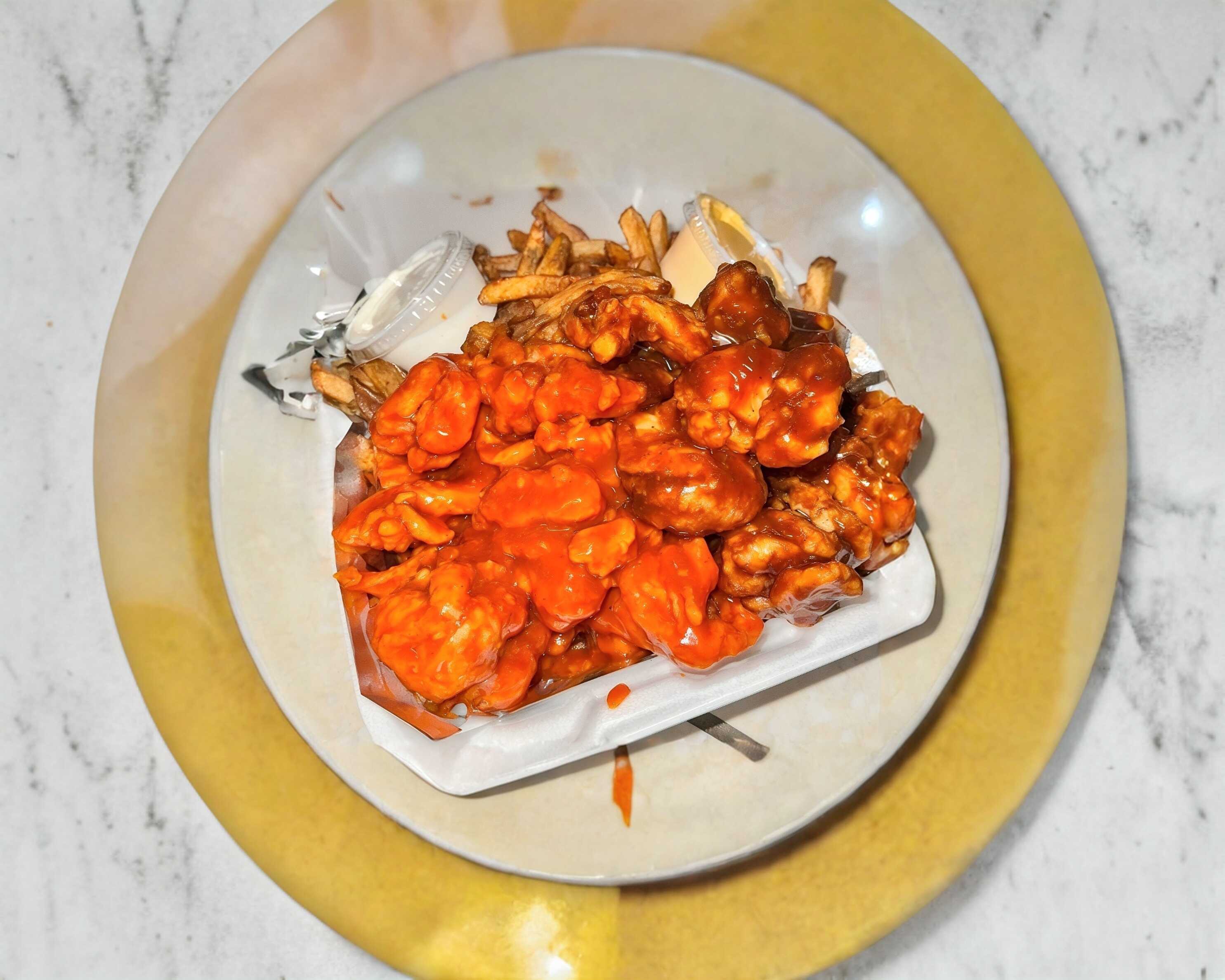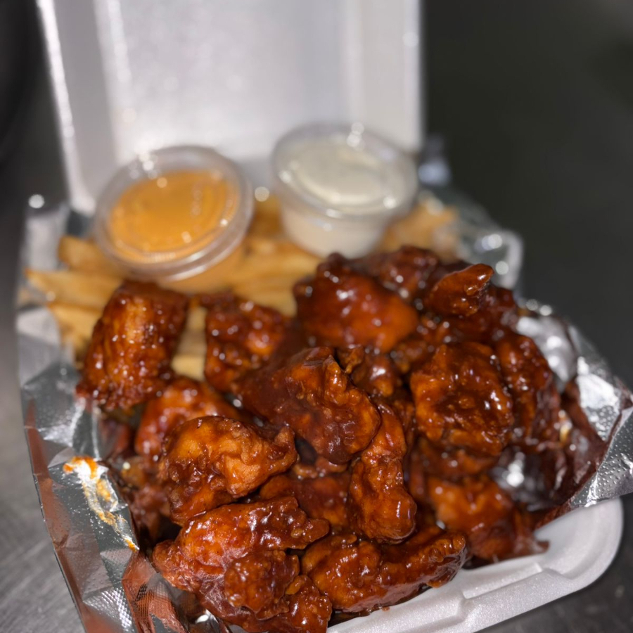 380gr de Boneless bañados en tu Salsa Favorita, porcion de papas y 1 Ranch.