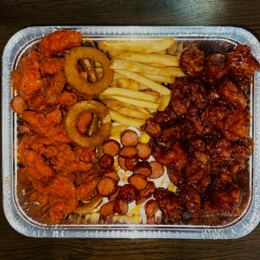 Incluye 2 Ordenes y Media de boneless, 1 Orden de Papas Fritas, 1/2 Orden de Salchipapas, 8 aros de cebolla y aderezos (Ranchs-Quesos-Ketchups)