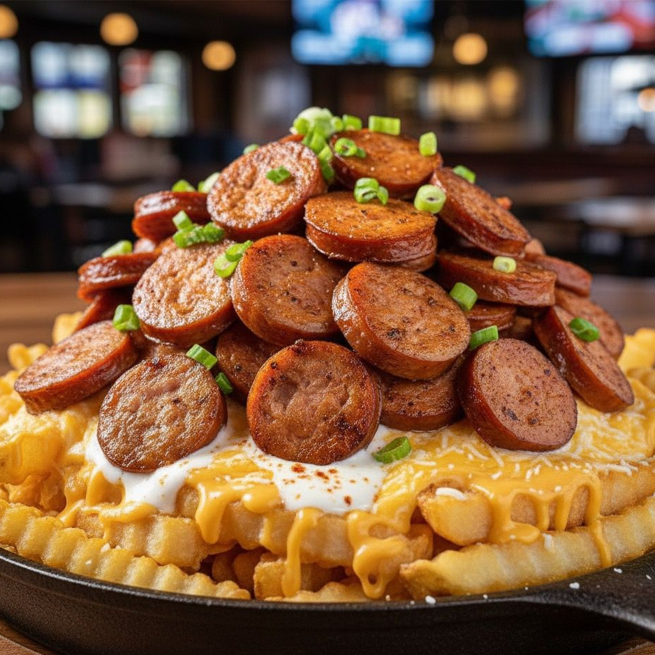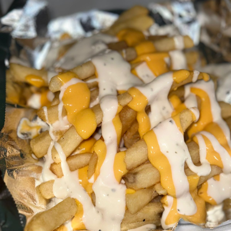 Papas fritas bañadas con queso y ranch, encima dos salchichas cortadas y fritas