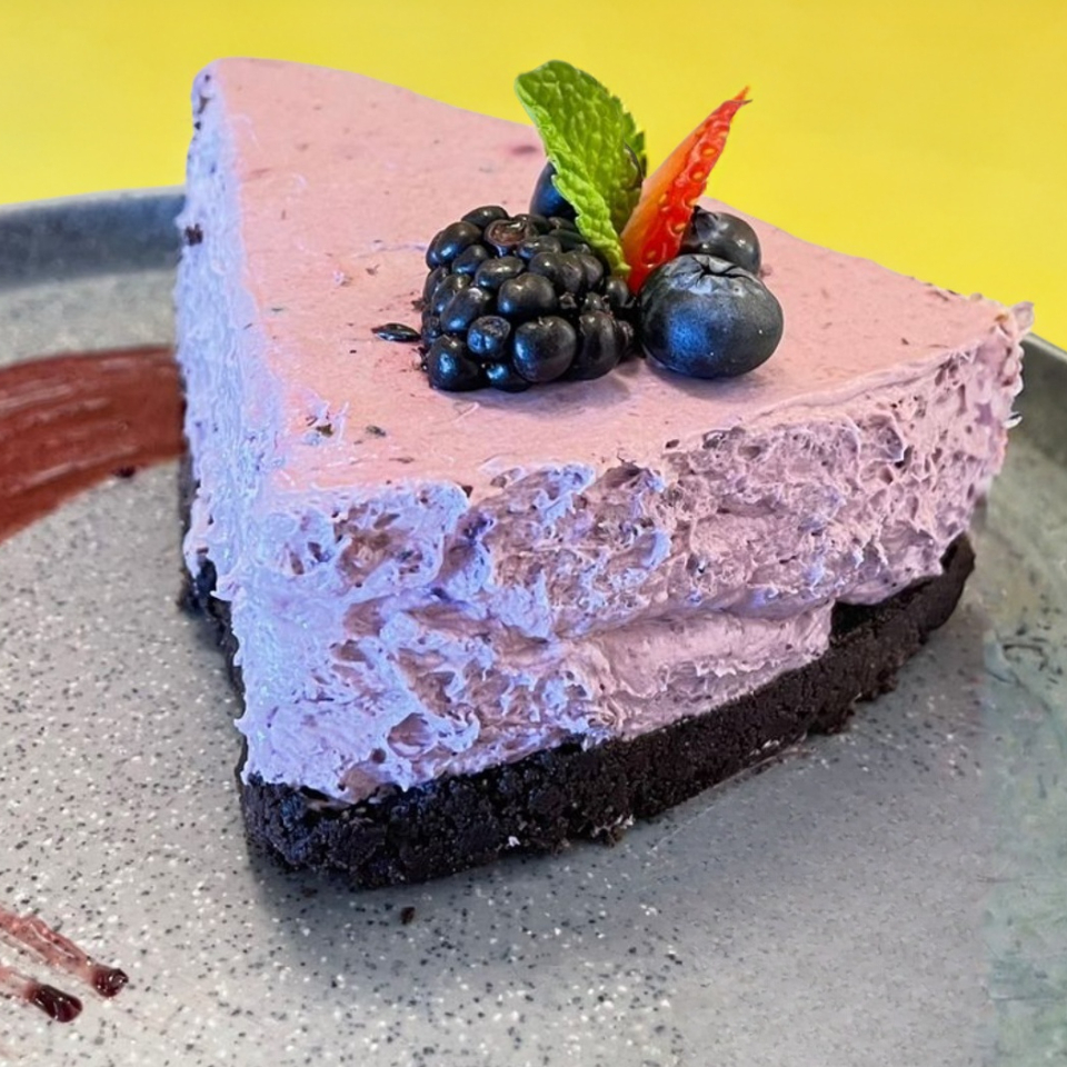 La especialidad de la casa consta de una deliciosa mezcla de queso crema, salsa blueberry y un toque de crema secreta, montado sobre una base de galleta oreo y decorado con fruta de temporada.