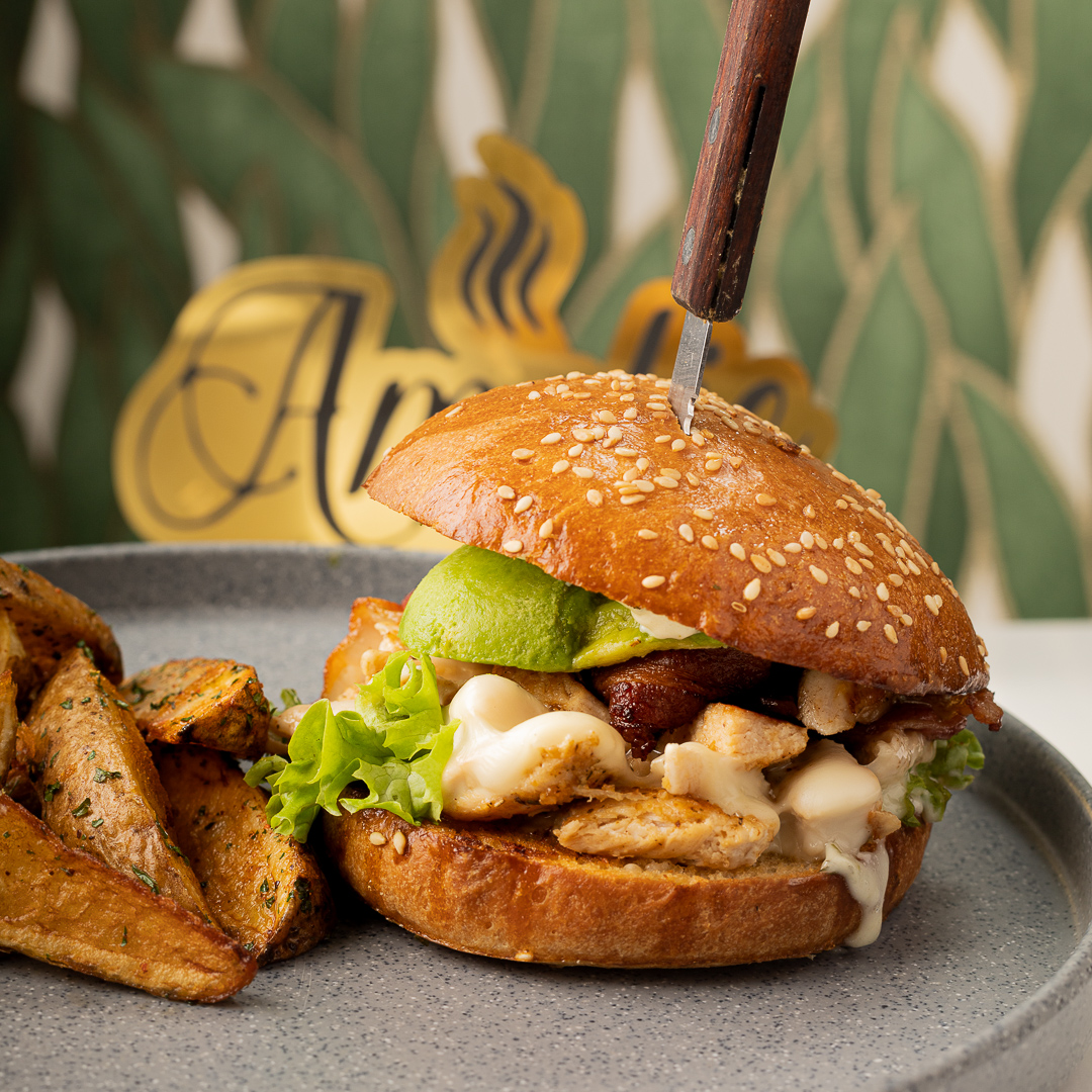 Pechuga de pollo con queso gratinado, lechuga, aguacate, tomate y cebolla, acompañado de 230 g de papa gajo, sazonadas con pimentón adobado y perejil seco.