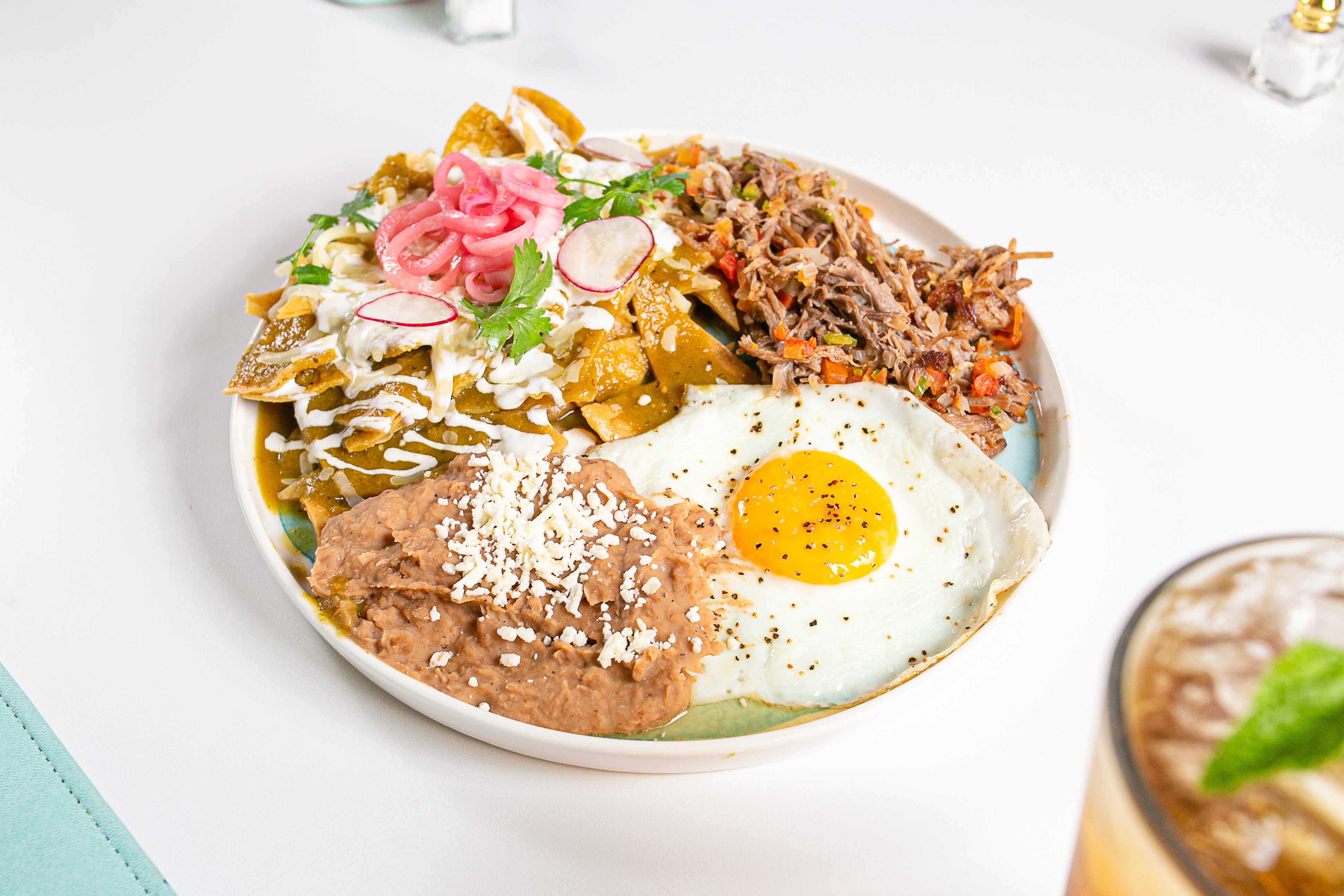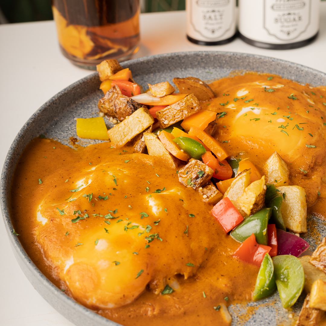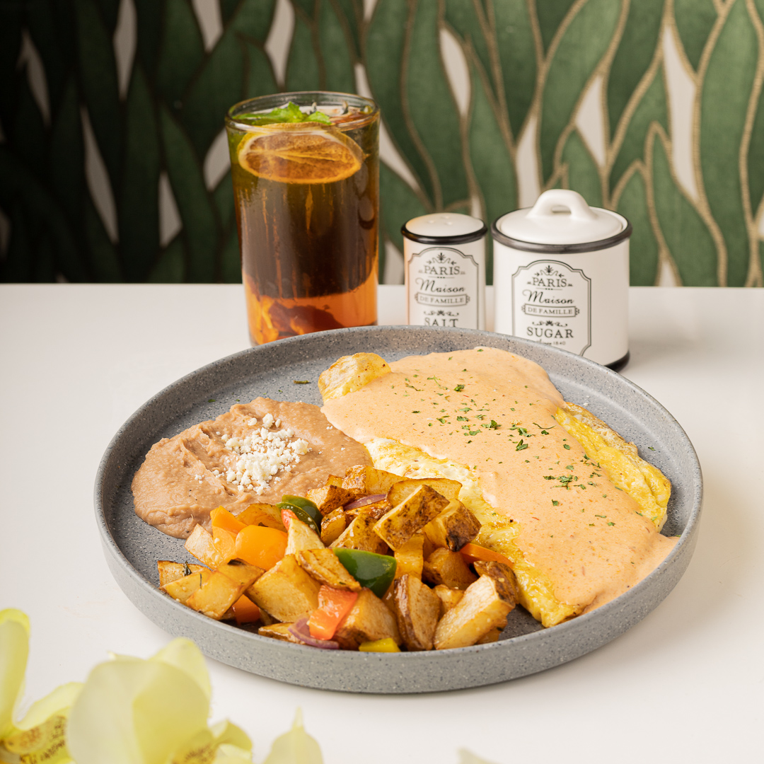 Queso y jamón, bañado en salsa chipotle. Acompañados de frijoles y papas rancheras.