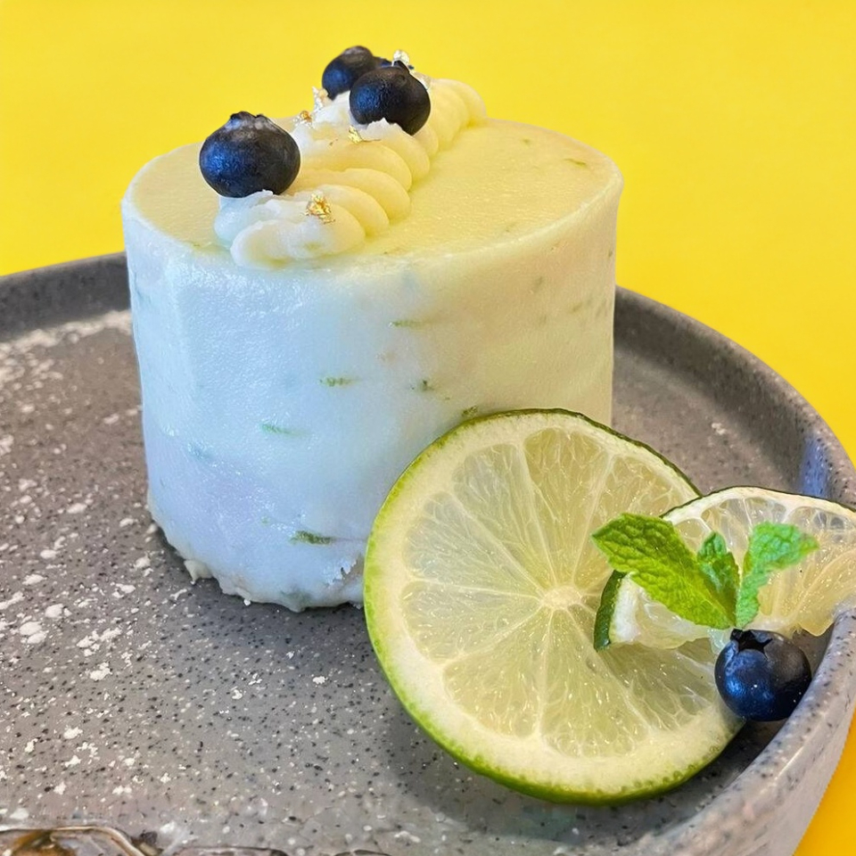 Bizcocho sabor limón, relleno de butter cream, decorado con limón y hoja de oro.