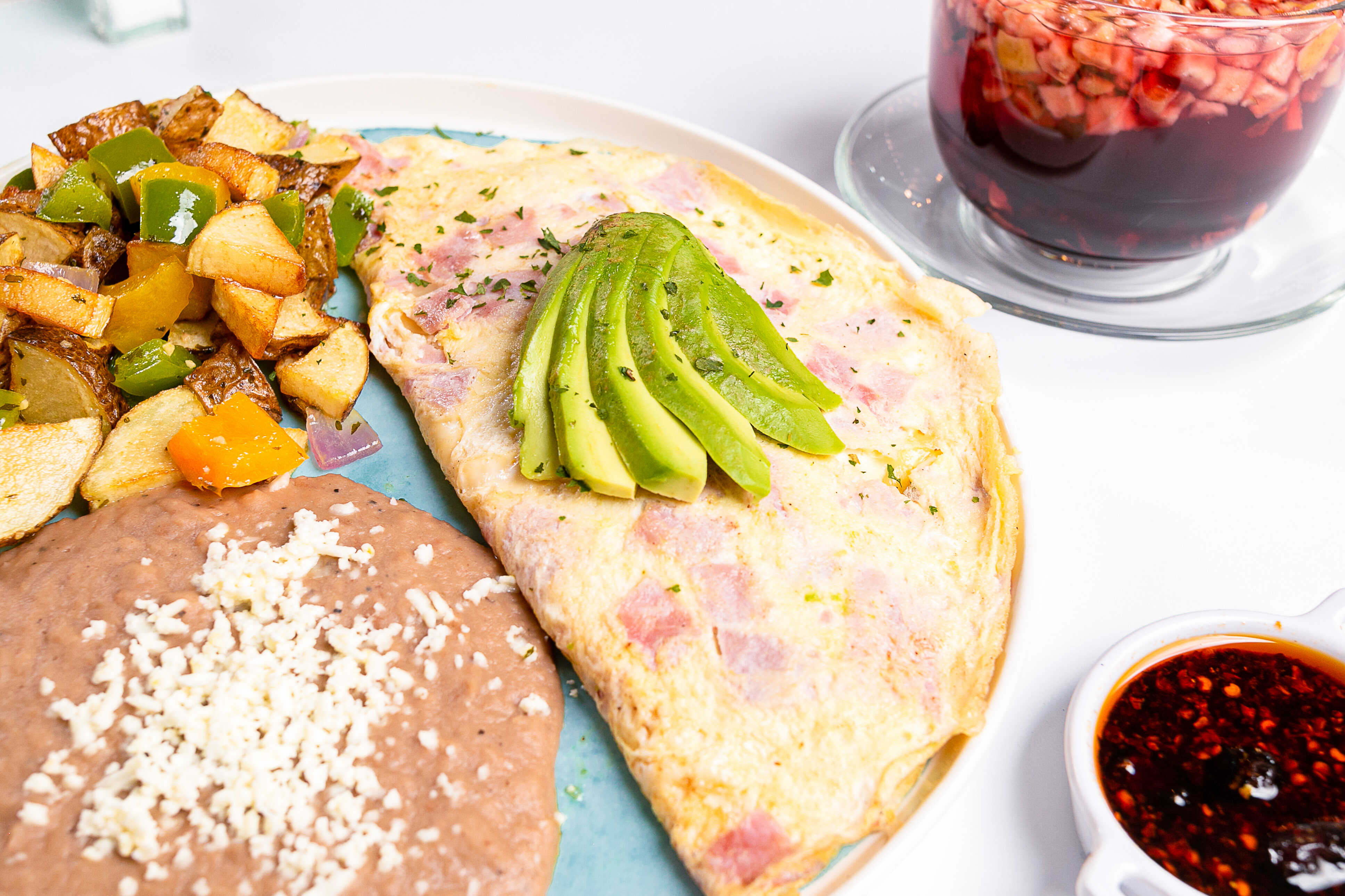 Queso, jamón y aguacate. Acompañados de frijoles y papas rancheras.