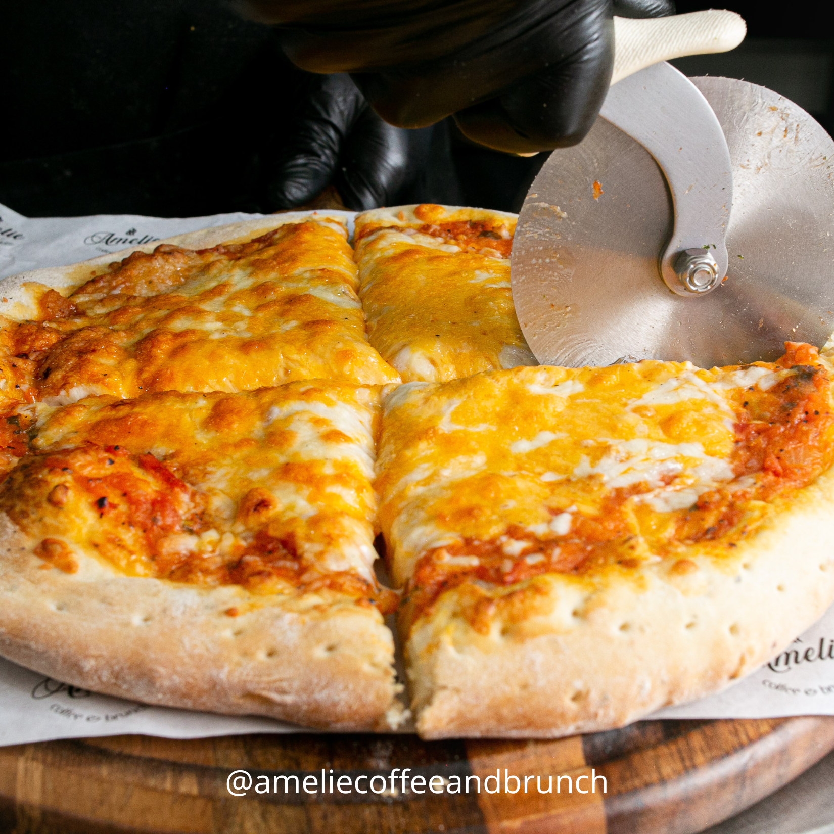 Salsa pomodoro de la casa, queso monterrey, queso cheddar y queso mozzarella.