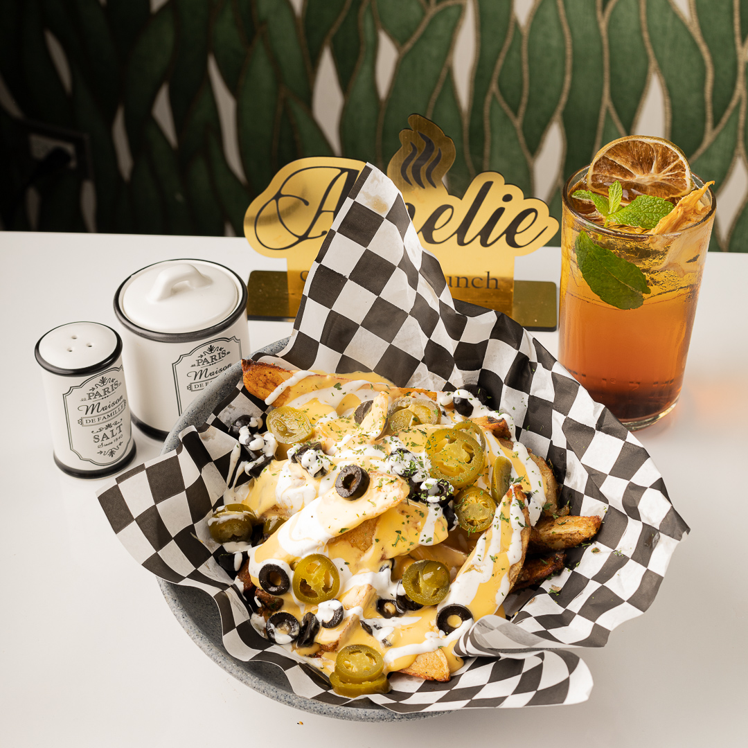 Tortilla en fritura profunda, queso cheddar, rallado con aderezo ranch de la casa, aceituna negra y jalapeño encurtido.