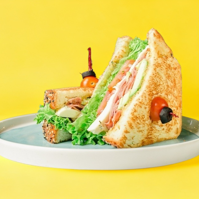 Pan de la casa, jamón de pechuga de pavo, queso panela, aguacate y mix de verduras, acompañado de 230 g de papas gajo, sazonadas con pimentón adobado y perejil seco.