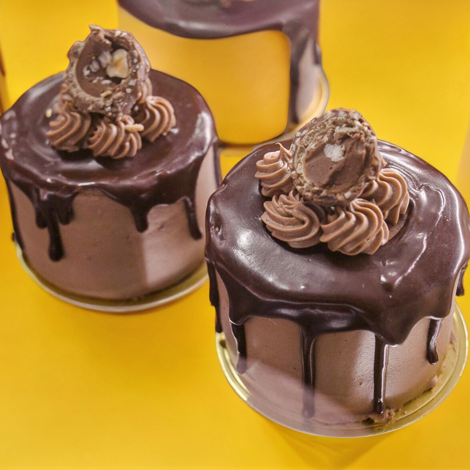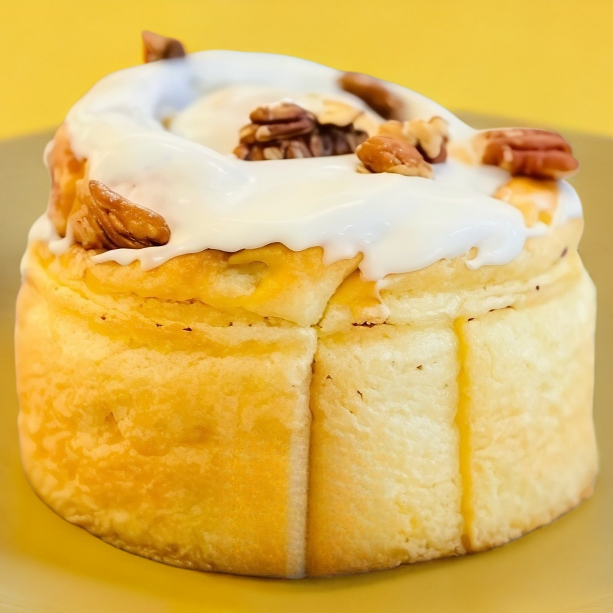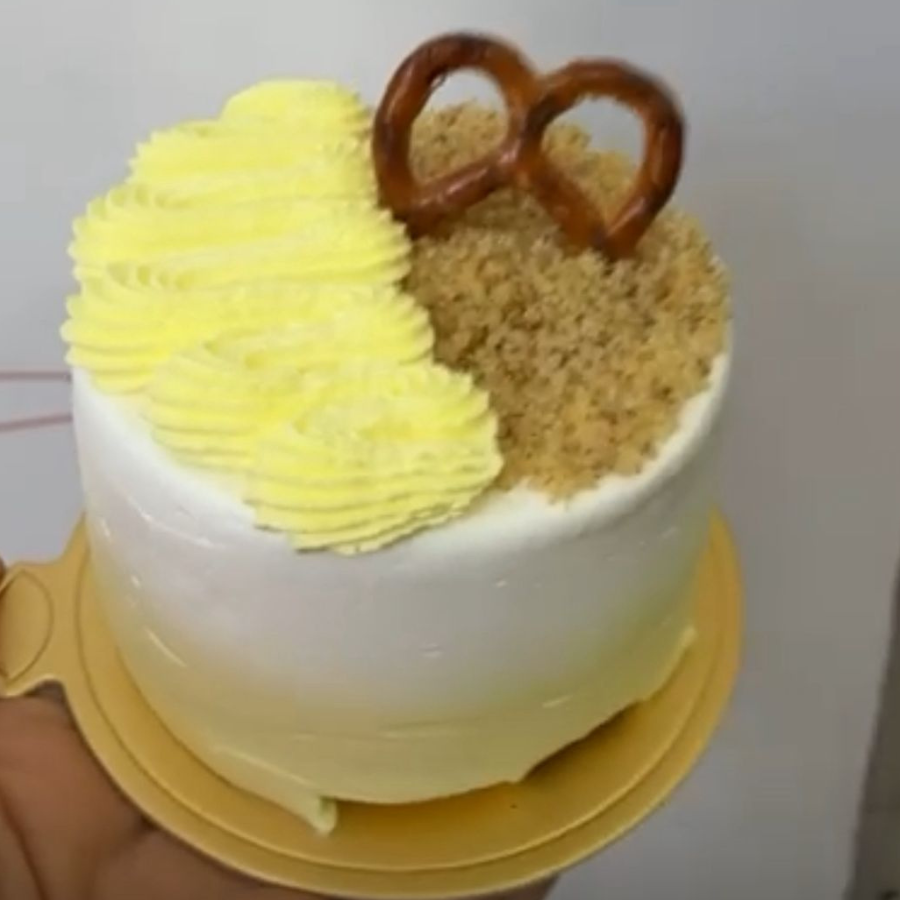 Bizcocho con delicioso sabor a plátano, relleno y cubierto de nuestro inigualable butter cream, nuez triturada en superficie, coronado con pretzel.