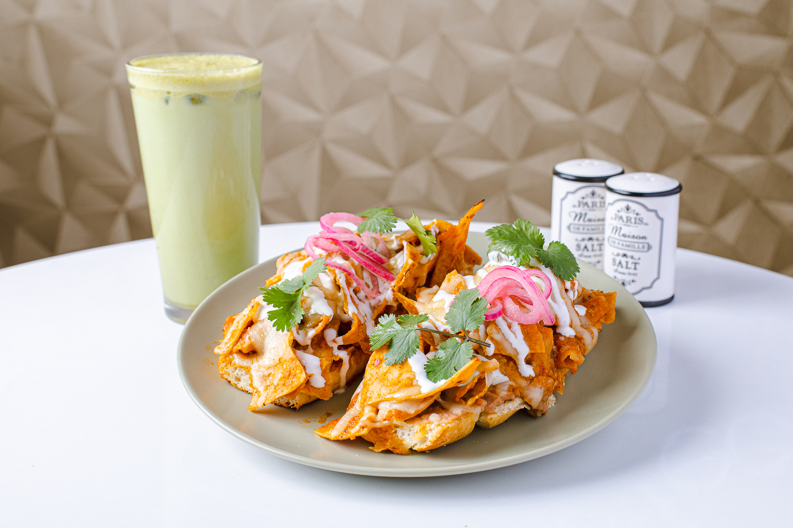 2 Piezas de pan baguette montado con frijol, queso monterrey y chilaquiles.