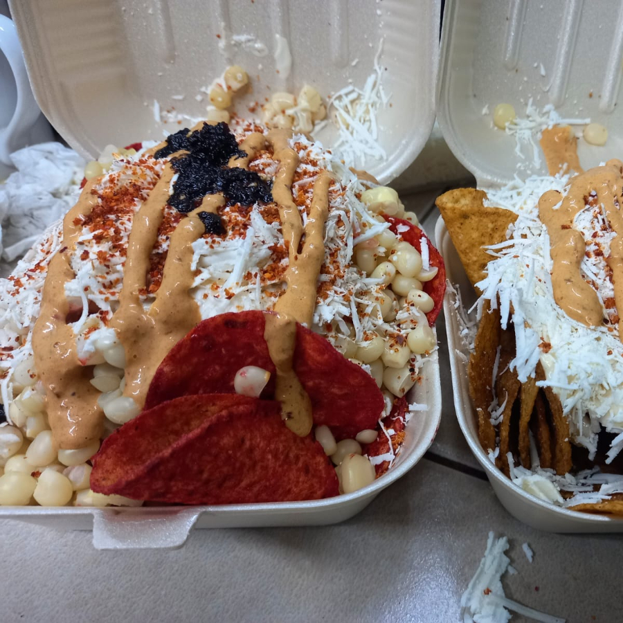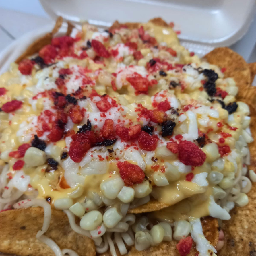 Deliciosos elotes cocidos desgranados, maruchan, queso para nachos y queso monterrey. Elige los topping de tu preferencia