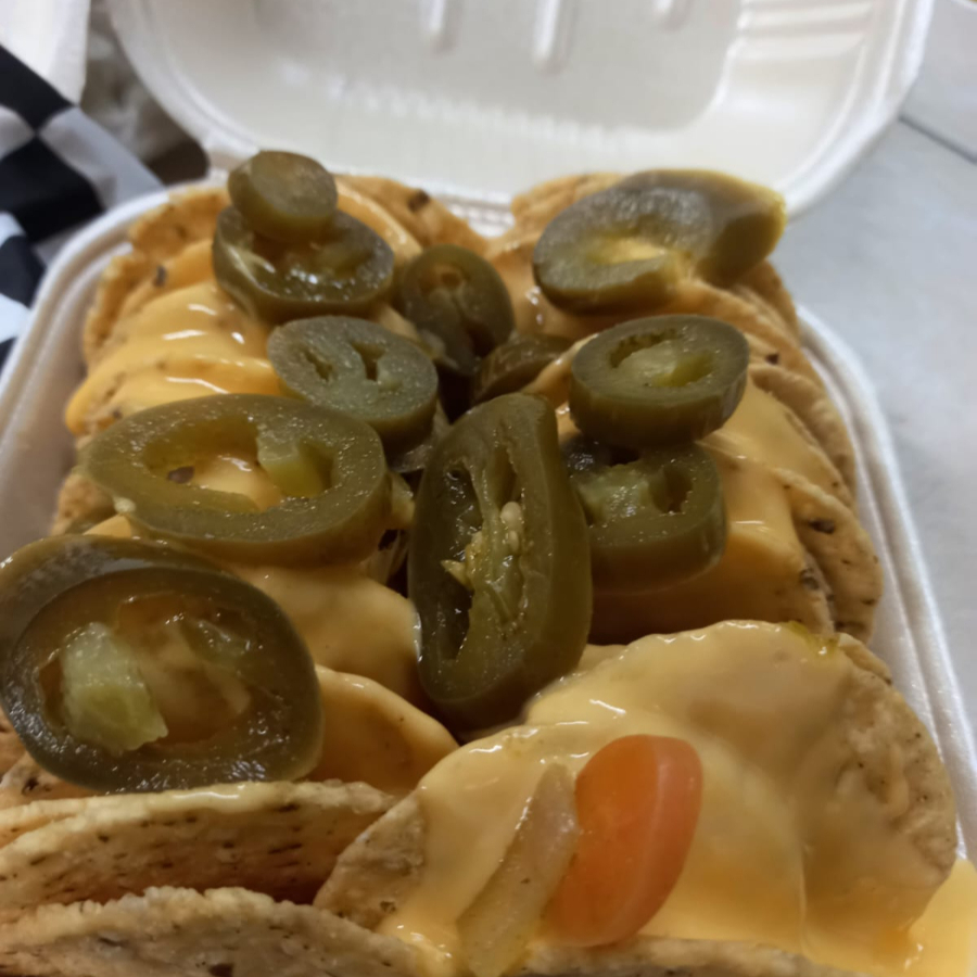 Totopos de maiz bañados con queso para nachos (queso monterrey y chiles encurtidos opcional)