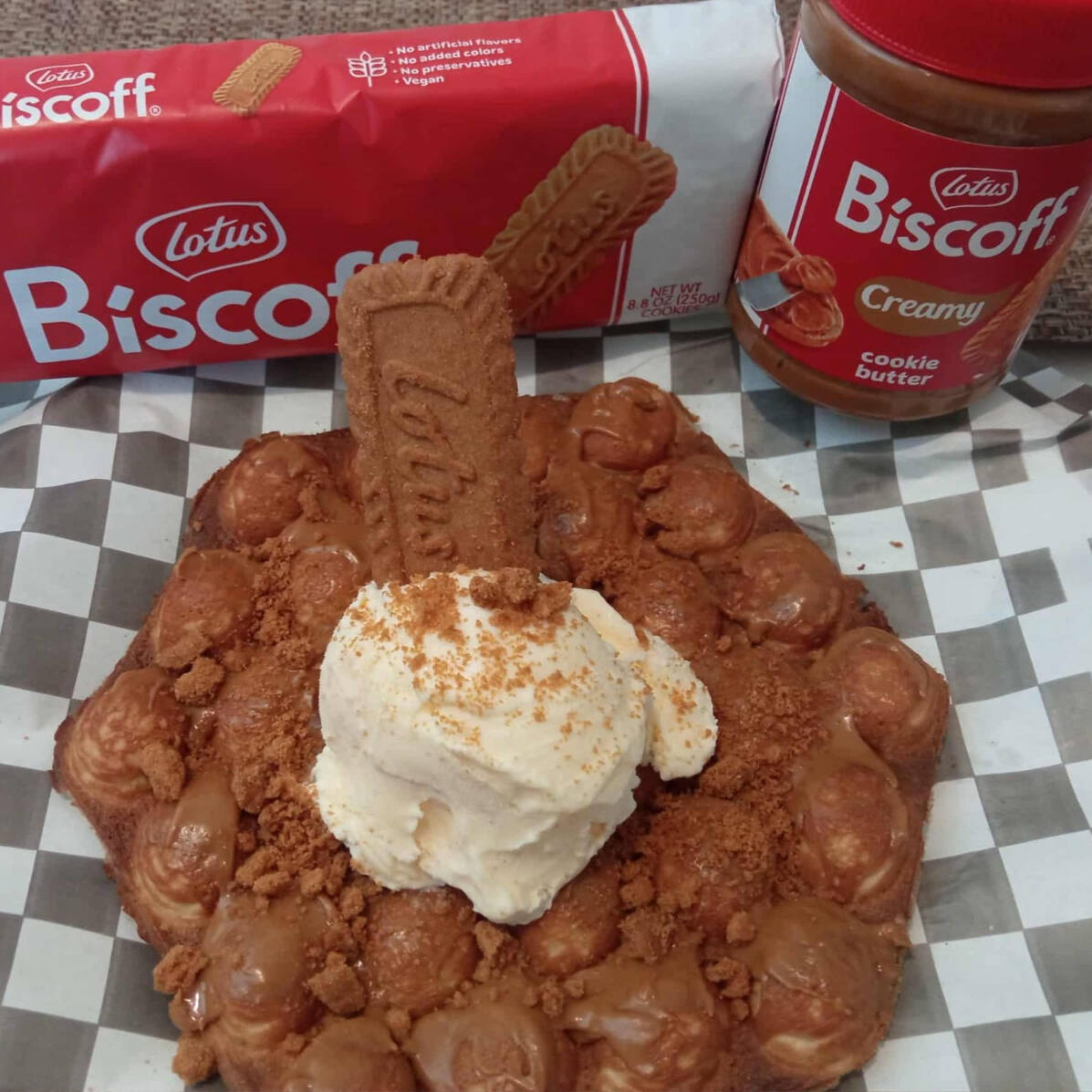 Delicioso waffle con crema de galleta Biscoff y galletas Biscoff trituradas