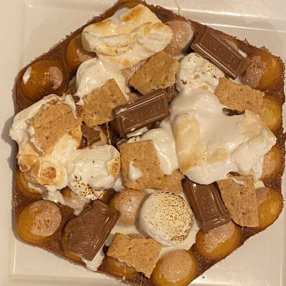 Delicioso waffle de harina de trigo con trozos de chocolate Hersheys, malvaviscos, galletas de trigo con miel, crema de malvavisco