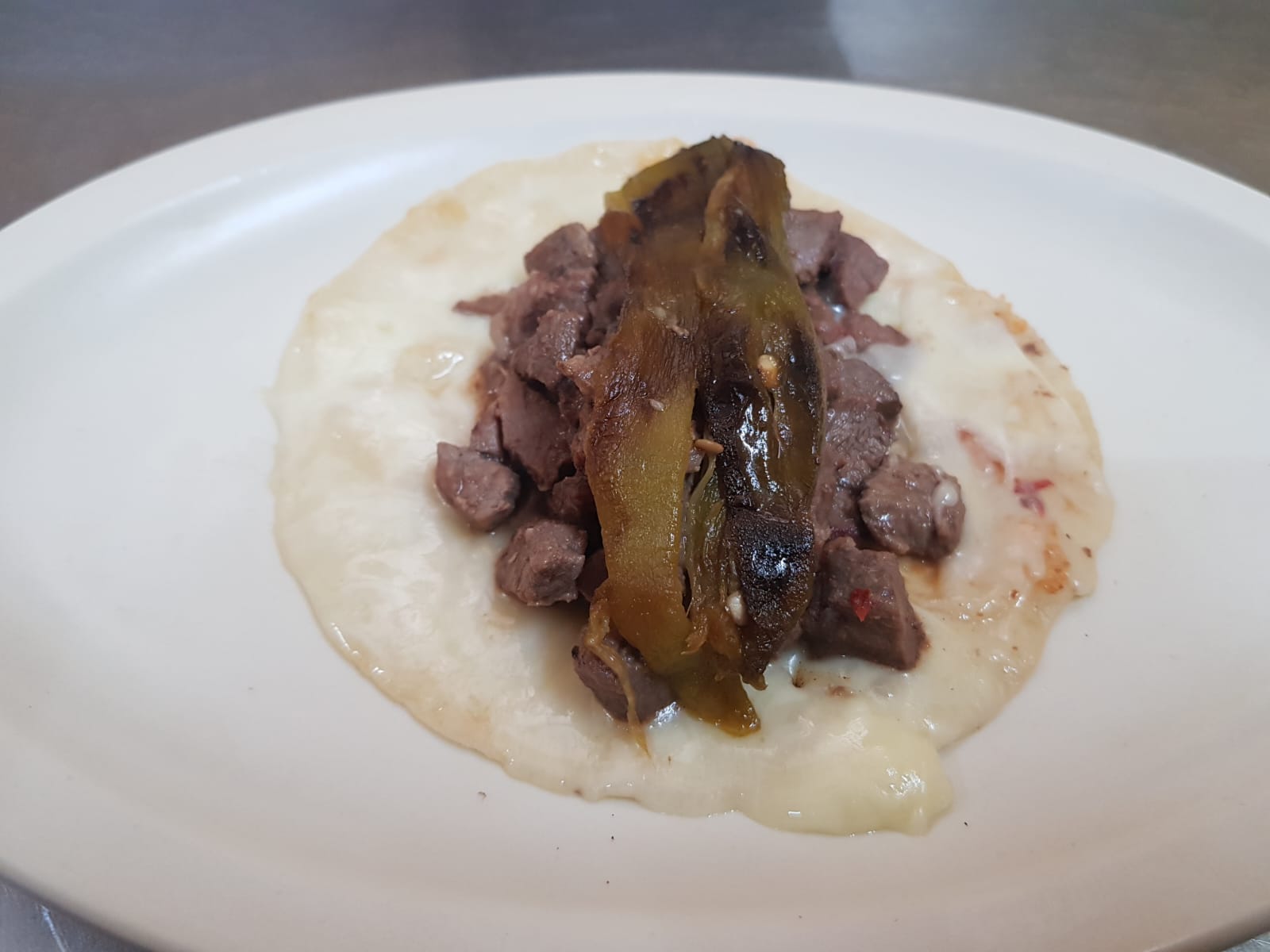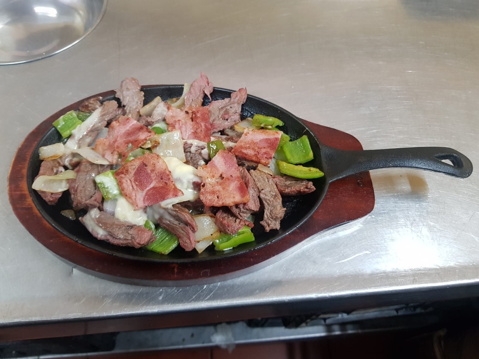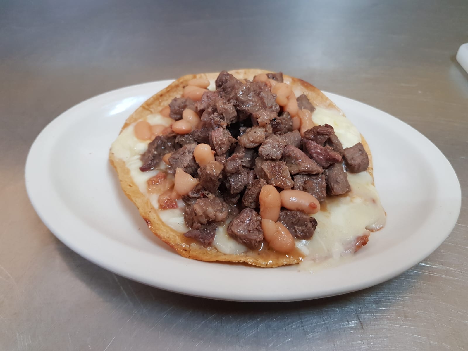 Carne de res asada con queso fundido, verduras y frijoles charros.