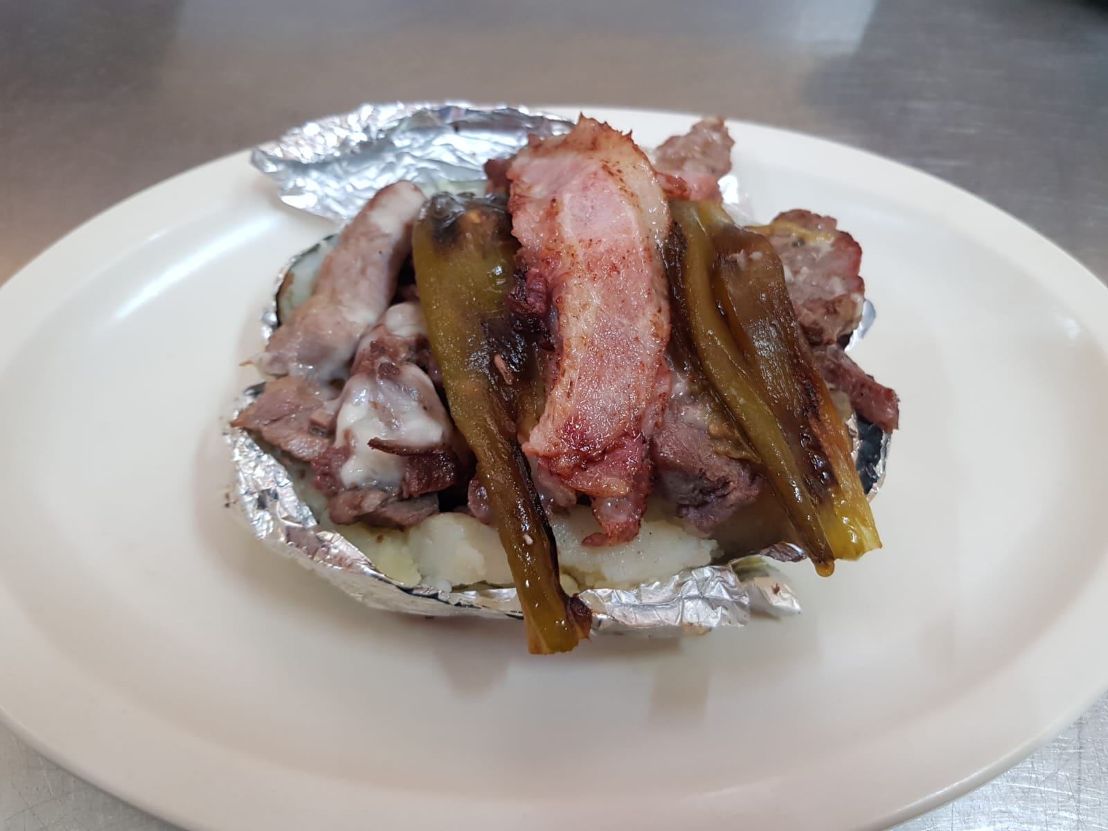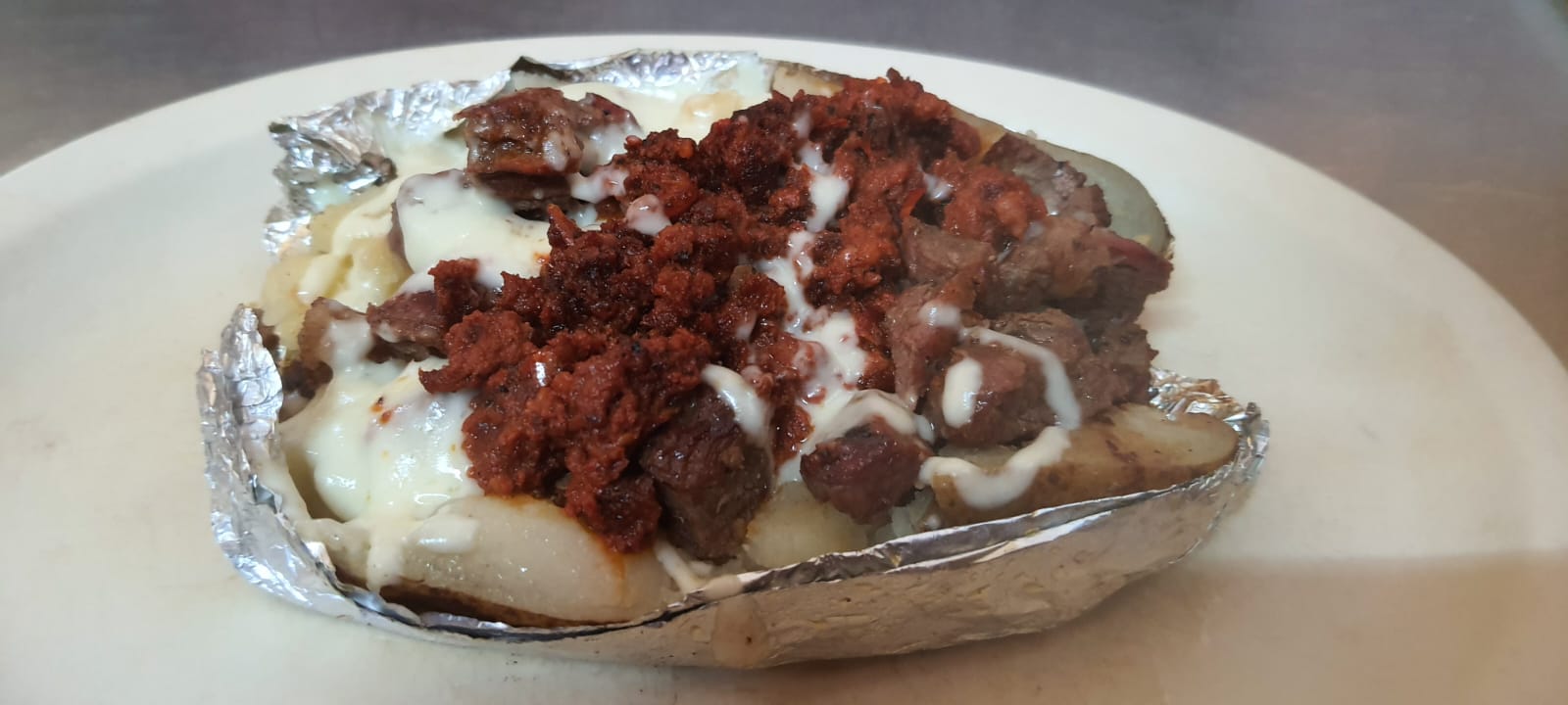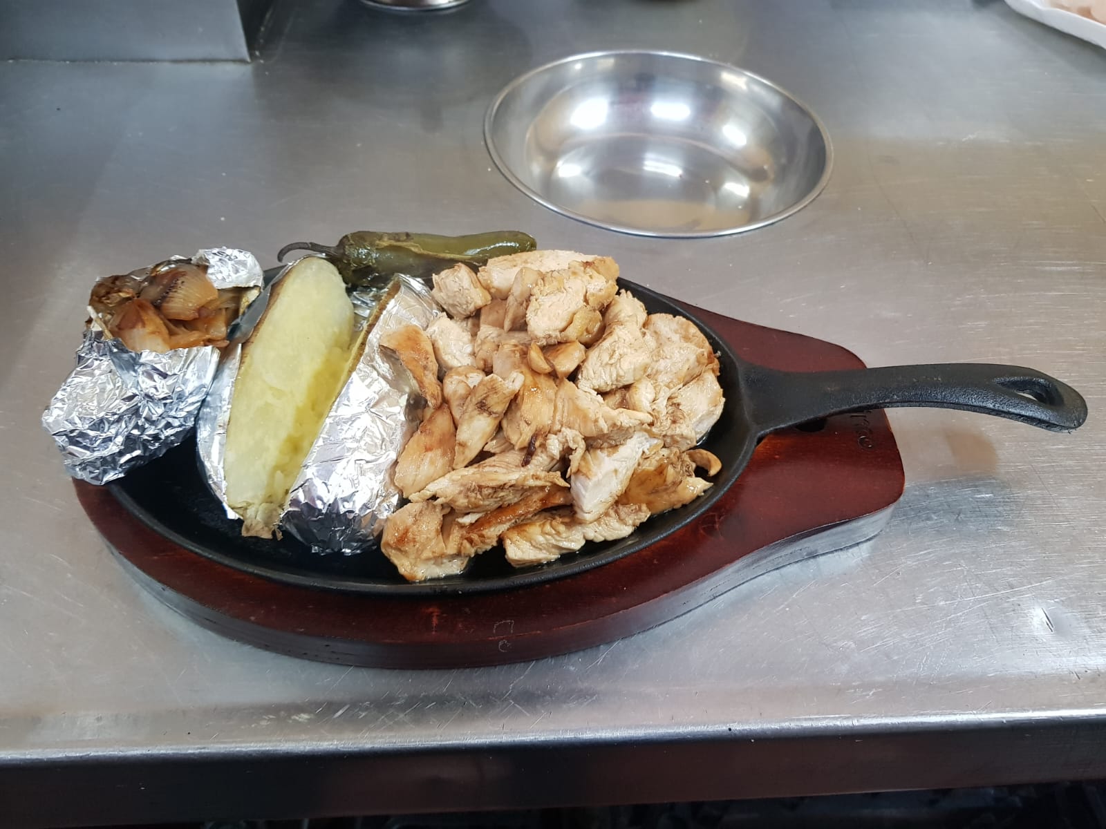 250 gr. de filete de pollo marinada, papa al horno, frijoles charros, cebollitas asadas, tortillas hechas a mano.